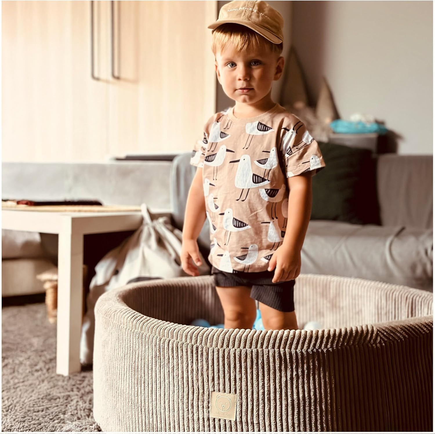 - Elegantes Design: Dank des stilvollen Stoffbezugs fügt sich das runde Bällebad harmonisch in jede Wohn- oder Kinderzimmereinrichtung ein.