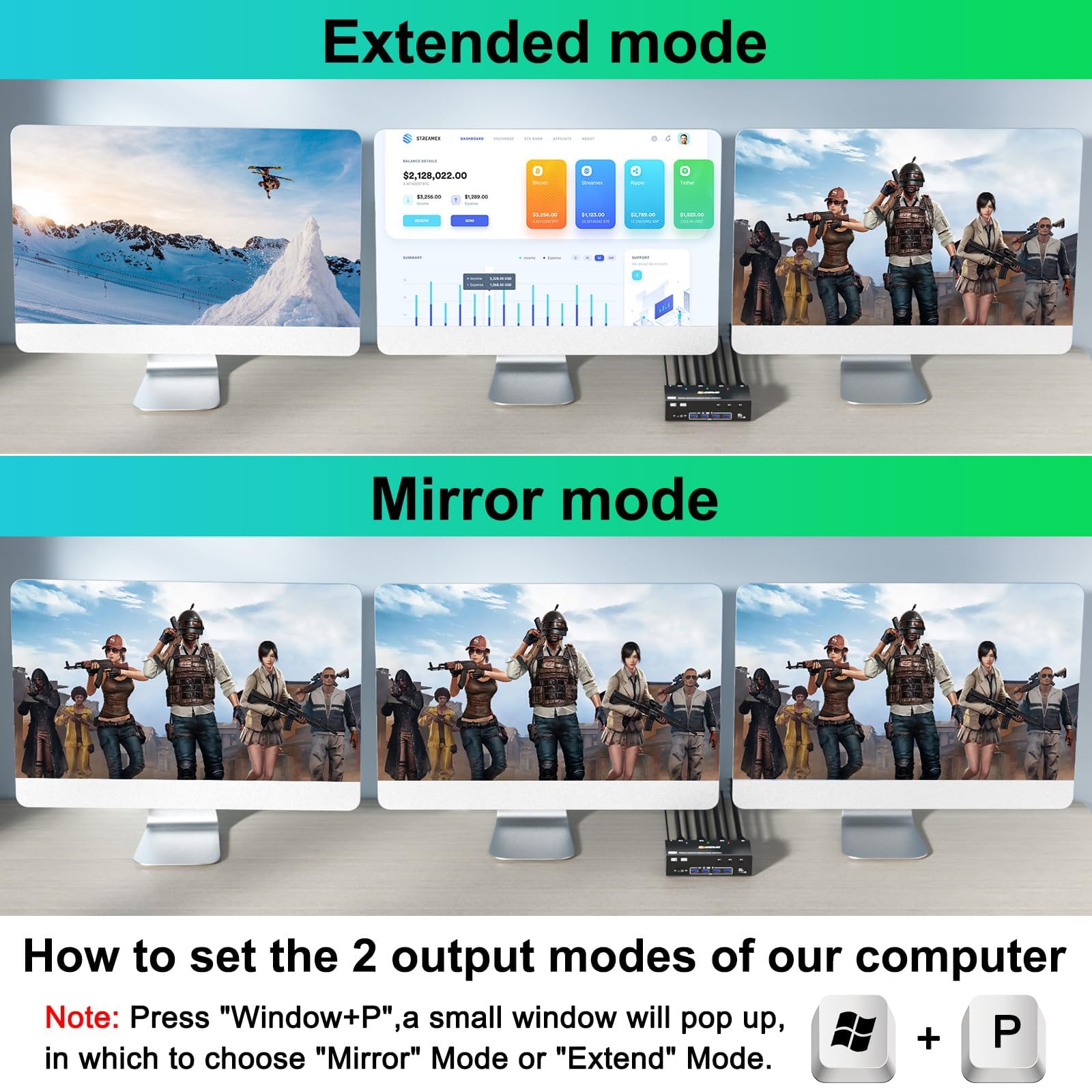 Der Switch bietet Ihnen volle Flexibilität bei der Anzeige. Nutzen Sie den Spiegel-Modus, um auf allen drei Monitoren den gleichen Inhalt anzuzeigen, oder den Erweiterungs-Modus, um Ihren Desktop über alle Bildschirme auszudehnen und eine riesige Arbeitsfläche für optimales Multitasking zu schaffen.
