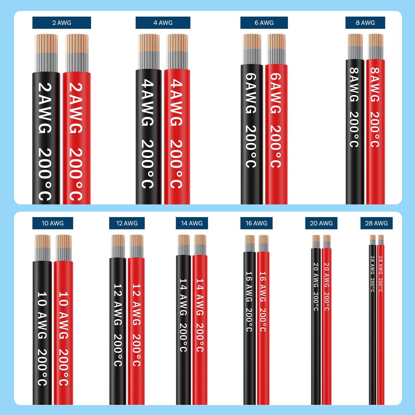 Dieses Set enthält zwei separate, hochflexible 8 AWG Silikonkabel. Sie erhalten ein 10 Meter langes rotes Kabel und ein 10 Meter langes schwarzes Kabel, also insgesamt 20 Meter.