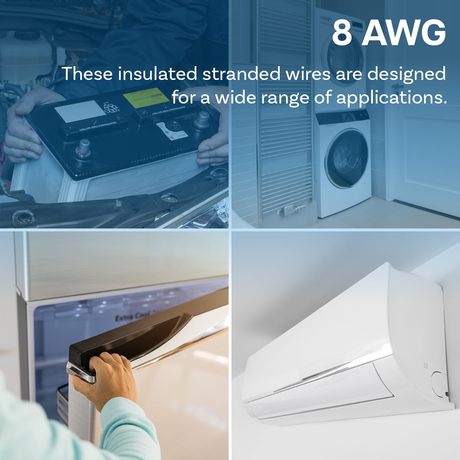 Dieses 8 AWG Kabelset (8,37 mm²) eignet sich perfekt für Anwendungen mit hohem Strombedarf, wie die Verkabelung von Autobatterien, Wechselrichtern in Solaranlagen, Schweissgeräten und leistungsstarken Car-HiFi-Anlagen. Es ist auch eine robuste Wahl für den Maschinenbau und grosse Haushaltsgeräte.