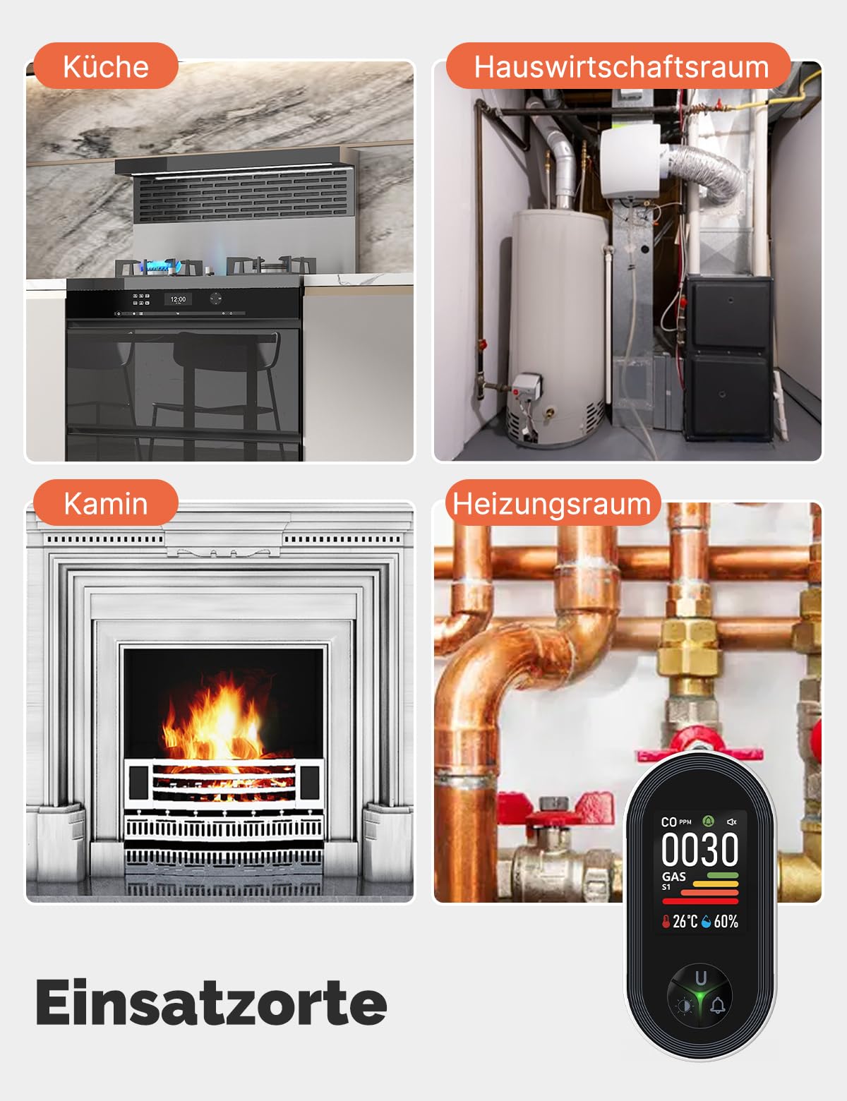 - Doppel-Sensor-Technologie: Ein Gerät erfasst zuverlässig sowohl Kohlenmonoxid (CO) als auch brennbare Gase wie Erdgas (Methan), Propan und Ethan.