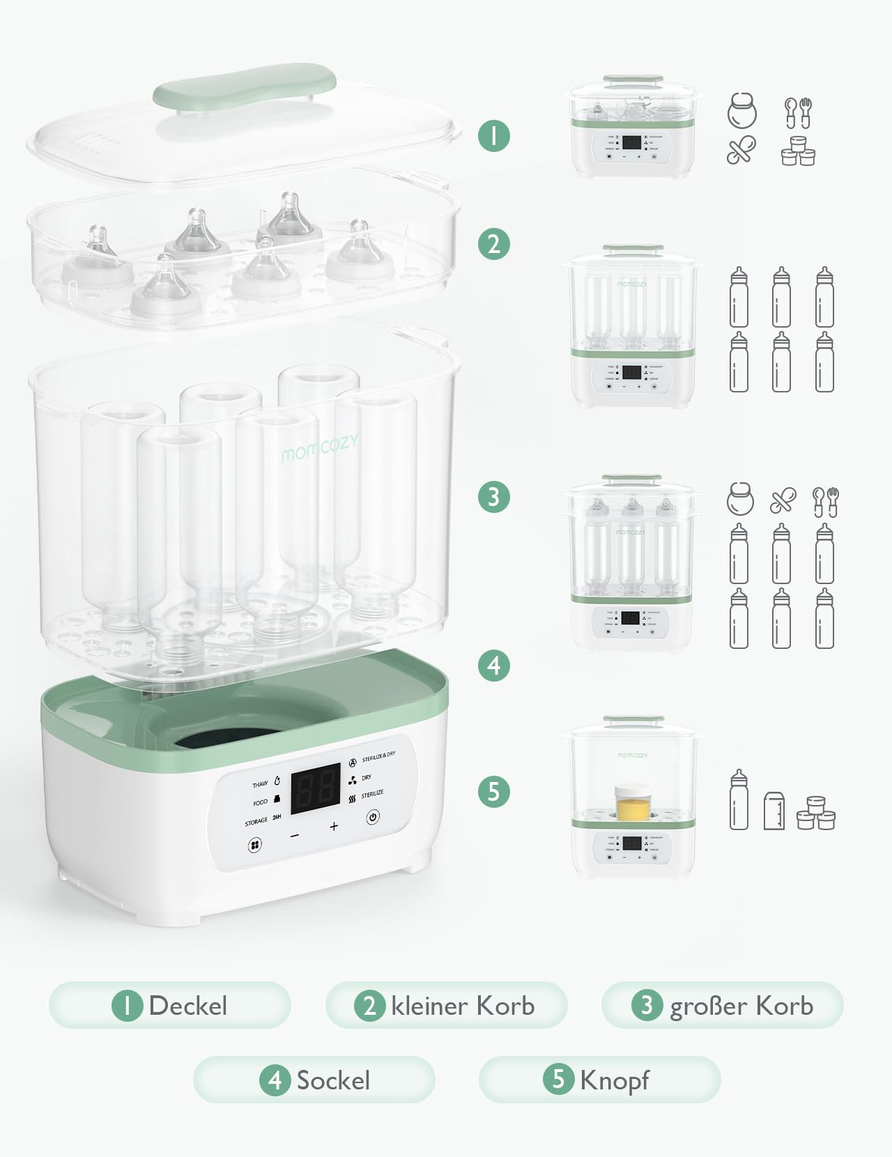Dieses multifunktionale Gerät kombiniert drei wesentliche Funktionen: Es sterilisiert Babyflaschen und Zubehör mit heissem Dampf, trocknet sie danach vollautomatisch und verfügt über eine präzise Funktion zum Erwärmen und Auftauen von Babynahrung und Milch.