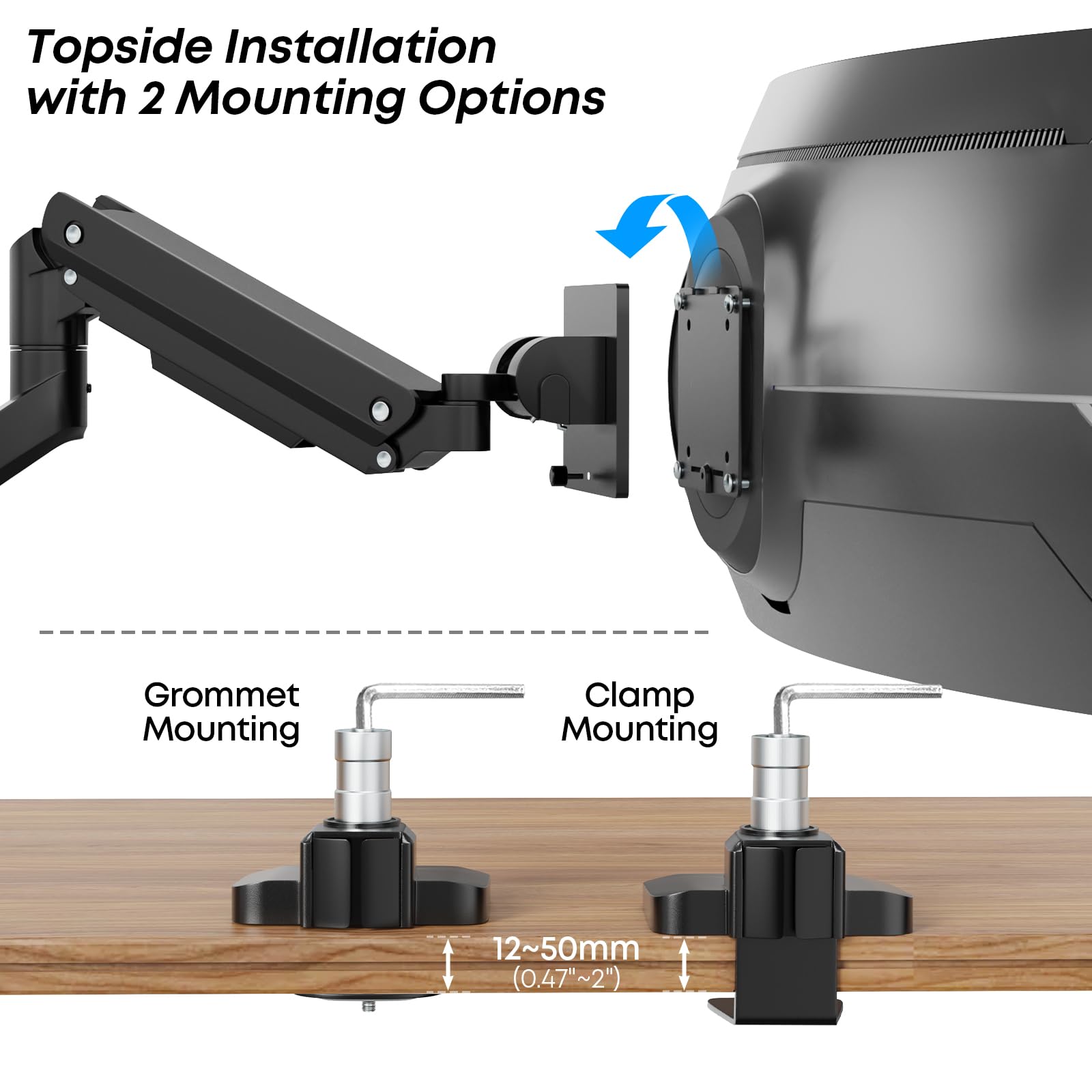 Dank der abnehmbaren VESA-Platte ist das Anbringen des Monitors ein Kinderspiel. Wählen Sie zwischen der C-Klemme für eine feste Montage am Tischrand oder der Tüllen-Montage für eine Installation durch eine Tischöffnung – beide Varianten garantieren einen sicheren Halt.