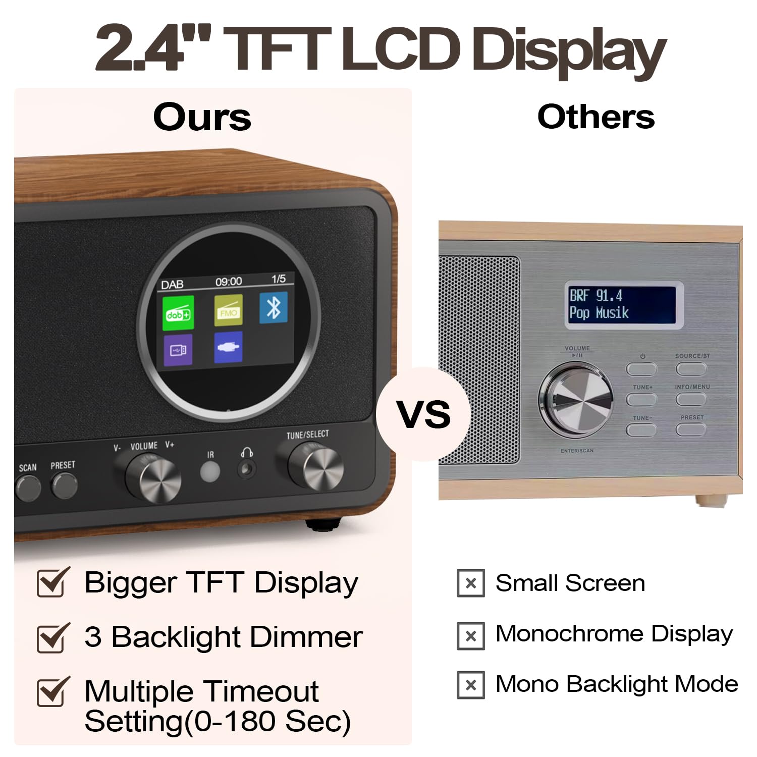 - Helles Farbdisplay: Ein 2.4-Zoll-TFT-Bildschirm zeigt Senderinformationen, Titel und sogar Album-Cover in Farbe an.
