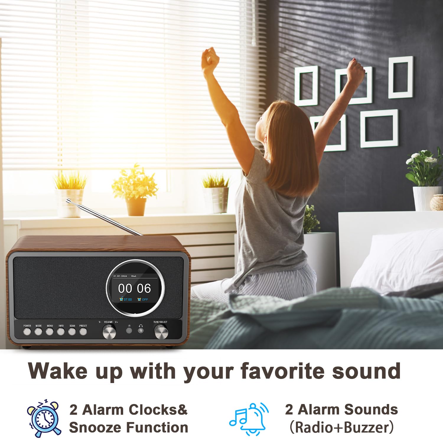 - Integrierter Wecker: Nutzen Sie den Doppelalarm mit Schlummerfunktion (Snooze) und Sleeptimer, um sich von Ihrem Lieblingssender oder einem Signalton wecken zu lassen.