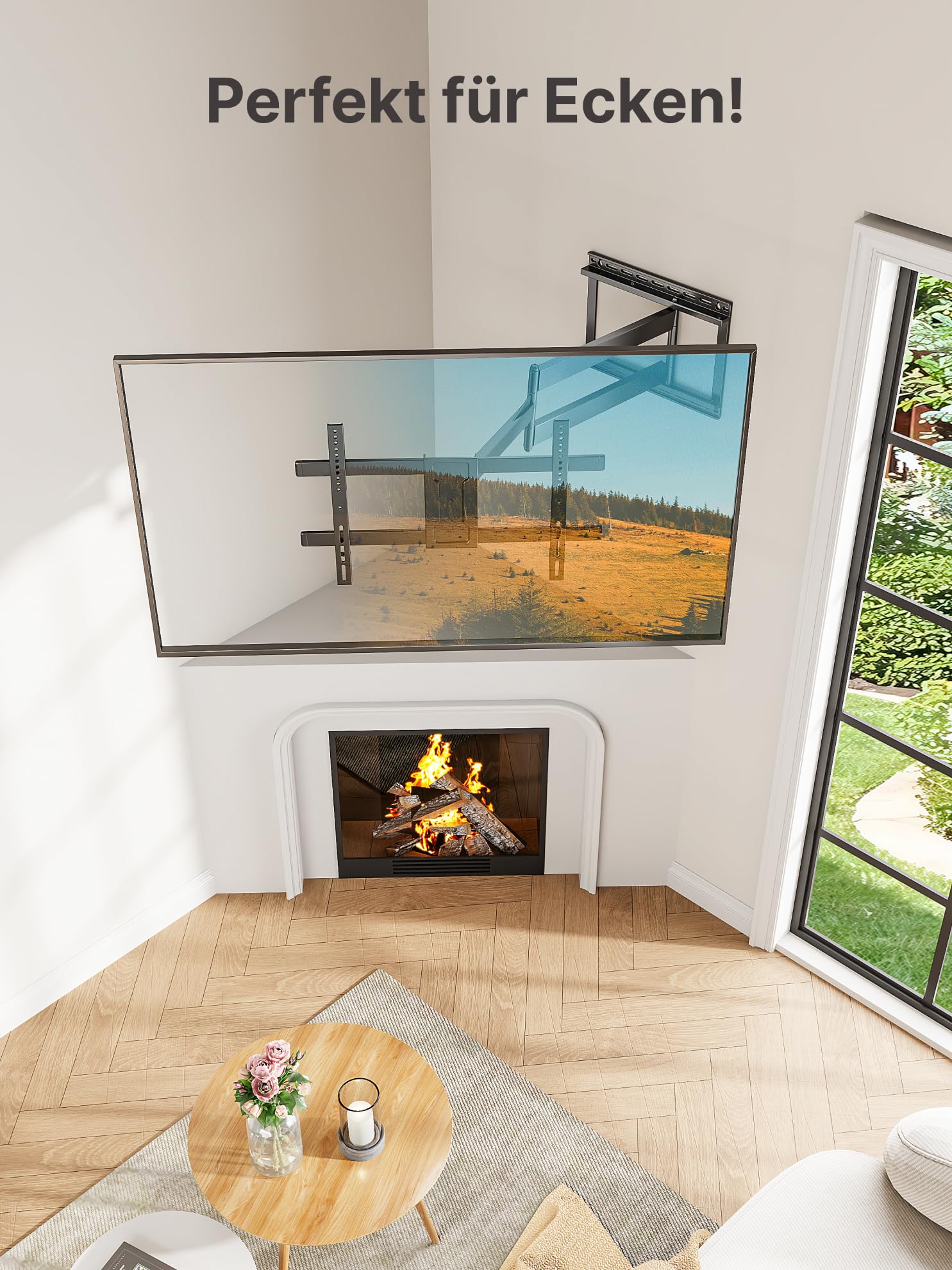 Ja, die Halterung ist ideal für die Eckmontage. Der aussergewöhnlich lange Schwenkarm lässt sich stufenlos bis auf 1067 mm von der Wand ausziehen, was eine perfekte Ausrichtung selbst in Ecken oder grossen Räumen ermöglicht. Eingefahren hat sie einen minimalen Wandabstand von nur 61 mm.