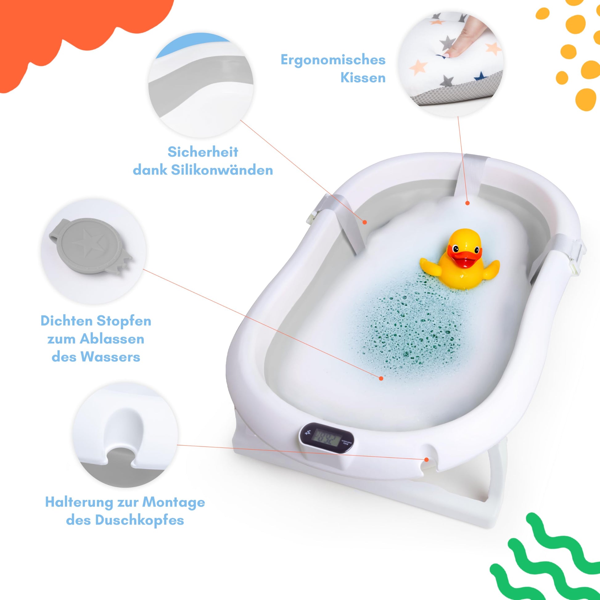 Für maximale Sicherheit sorgen mehrere Elemente: Das weiche Badekissen bietet optimalen Halt, rutschfeste Gummifüsse an Wanne und Gestell garantieren einen stabilen Stand, und das integrierte Digital-Thermometer ermöglicht eine präzise Kontrolle der Wassertemperatur.