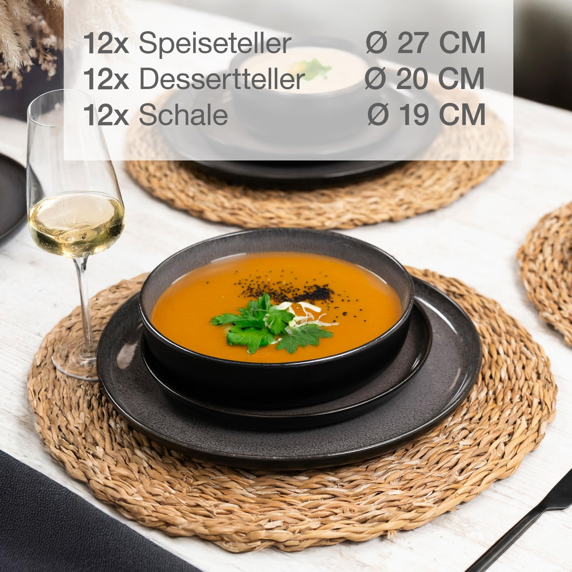 Das 36-teilige Set ist eine Komplettausstattung für 12 Personen. Es enthält jeweils 12 grosse Essteller, 12 Dessertteller und 12 tiefe Suppenteller in der Farbe Anthrazit.