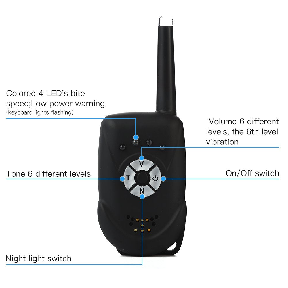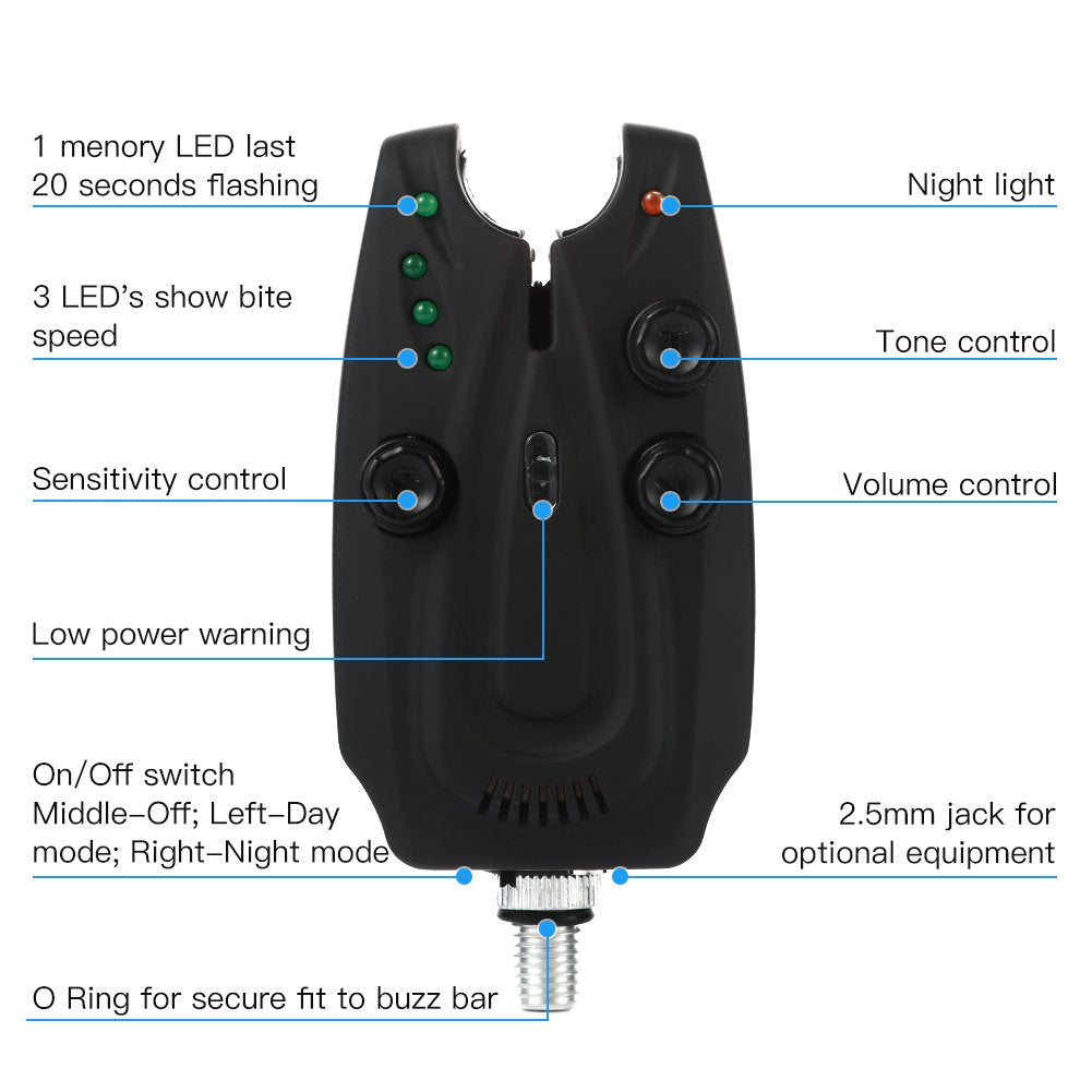 - Farbige LED-Alarmanzeige: Wenn ein Biss erfolgt, leuchtet am Empfänger eine spezifische LED auf (Rot, Grün oder Blau), sodass Sie sofort wissen, an welcher Rute die Aktivität stattfindet.