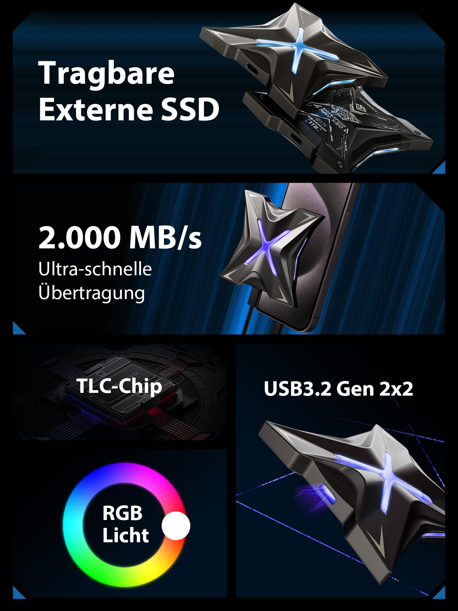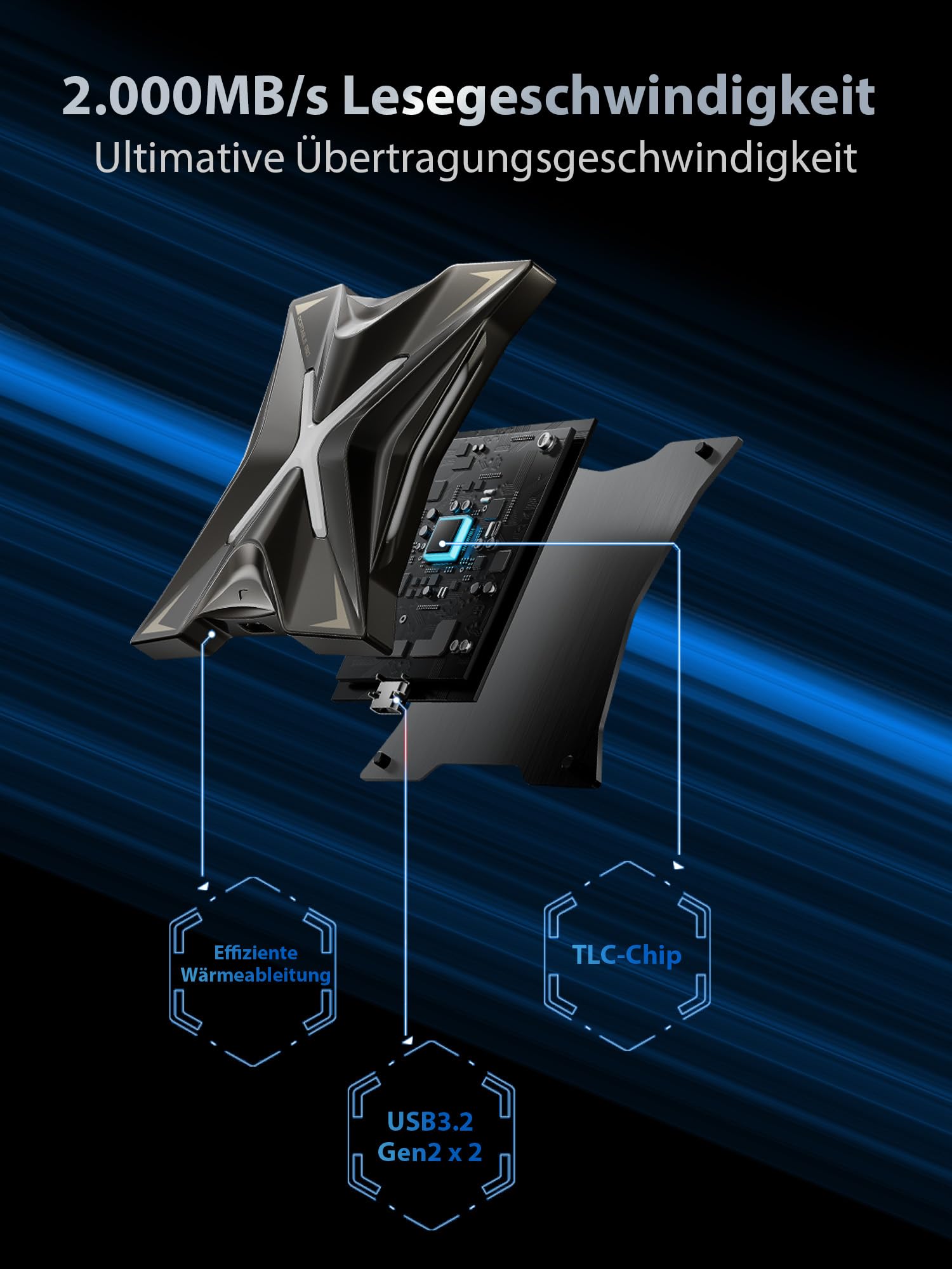 - Auffällige Optik: Das einzigartige, X-förmige Design wird durch eine dynamische RGB-Beleuchtung ergänzt und macht die Festplatte zu einem echten Blickfang.