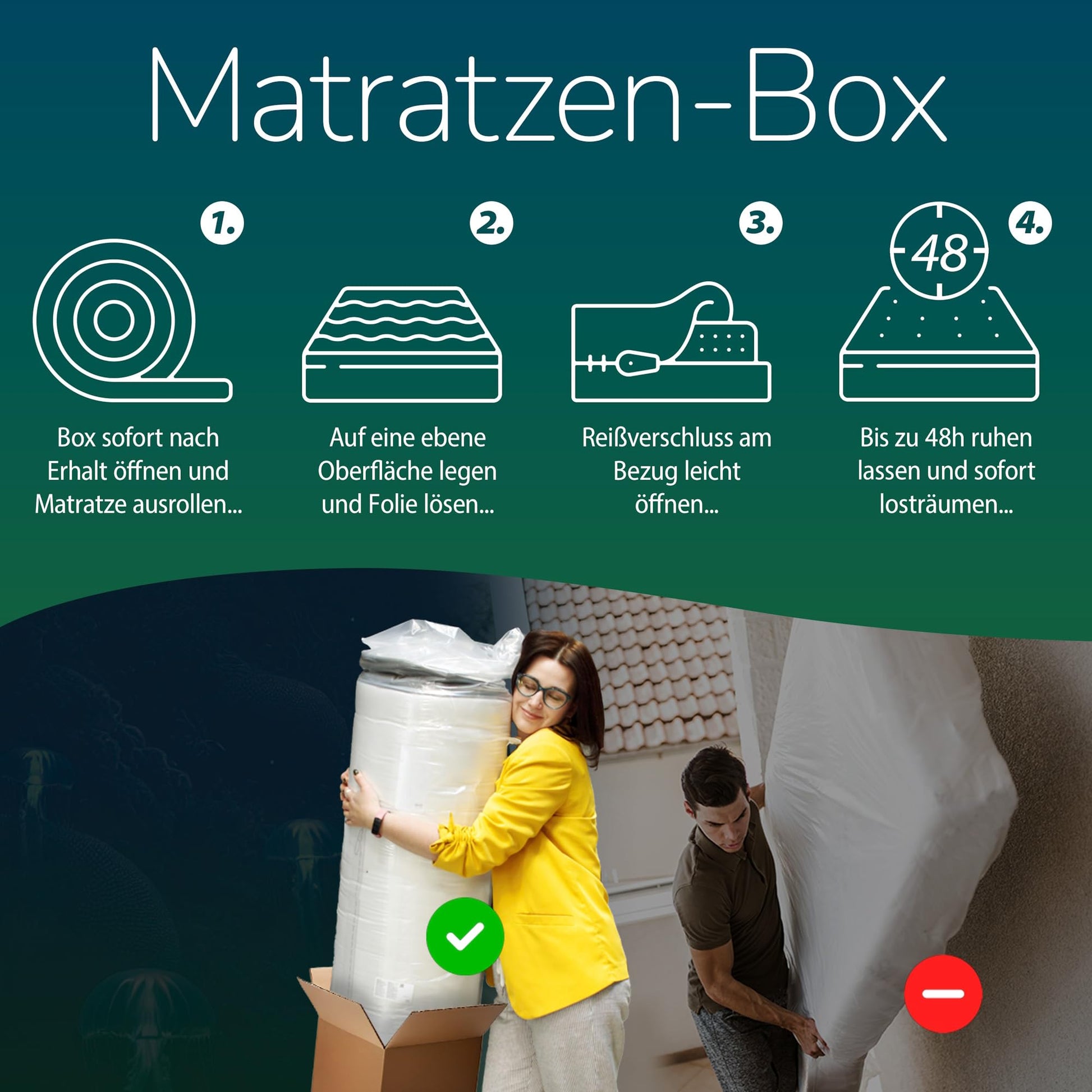 Für einen einfachen und sicheren Transport wird Ihre neue Matratze gerollt und in einem kompakten Karton geliefert. Bitte geben Sie ihr nach dem Auspacken je nach Raumklima etwa 6 bis 24 Stunden Zeit, um sich vollständig zu entfalten und ihre finale Höhe von ca. 16 cm zu erreichen.