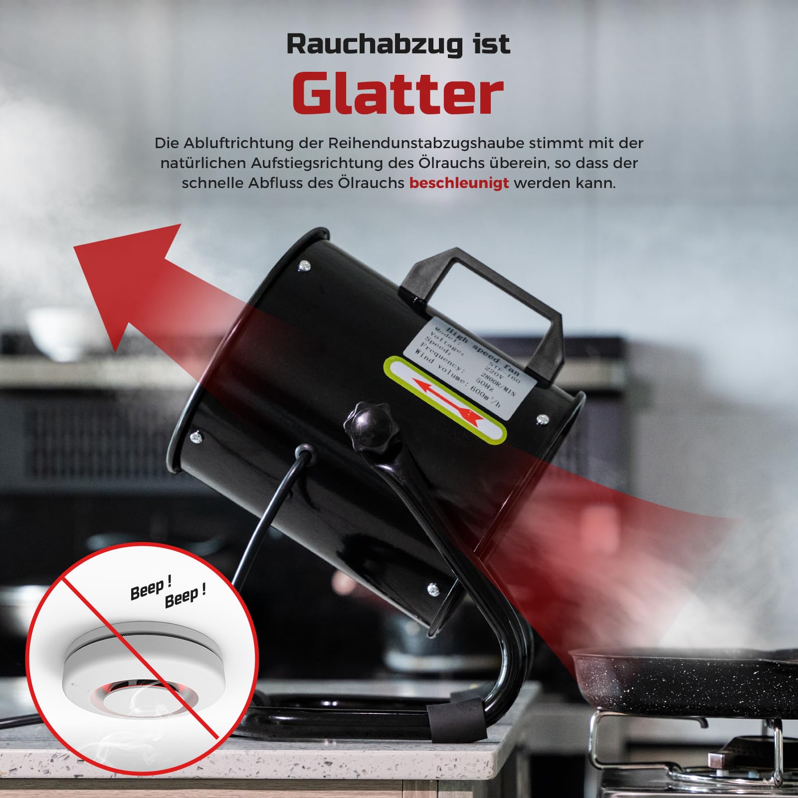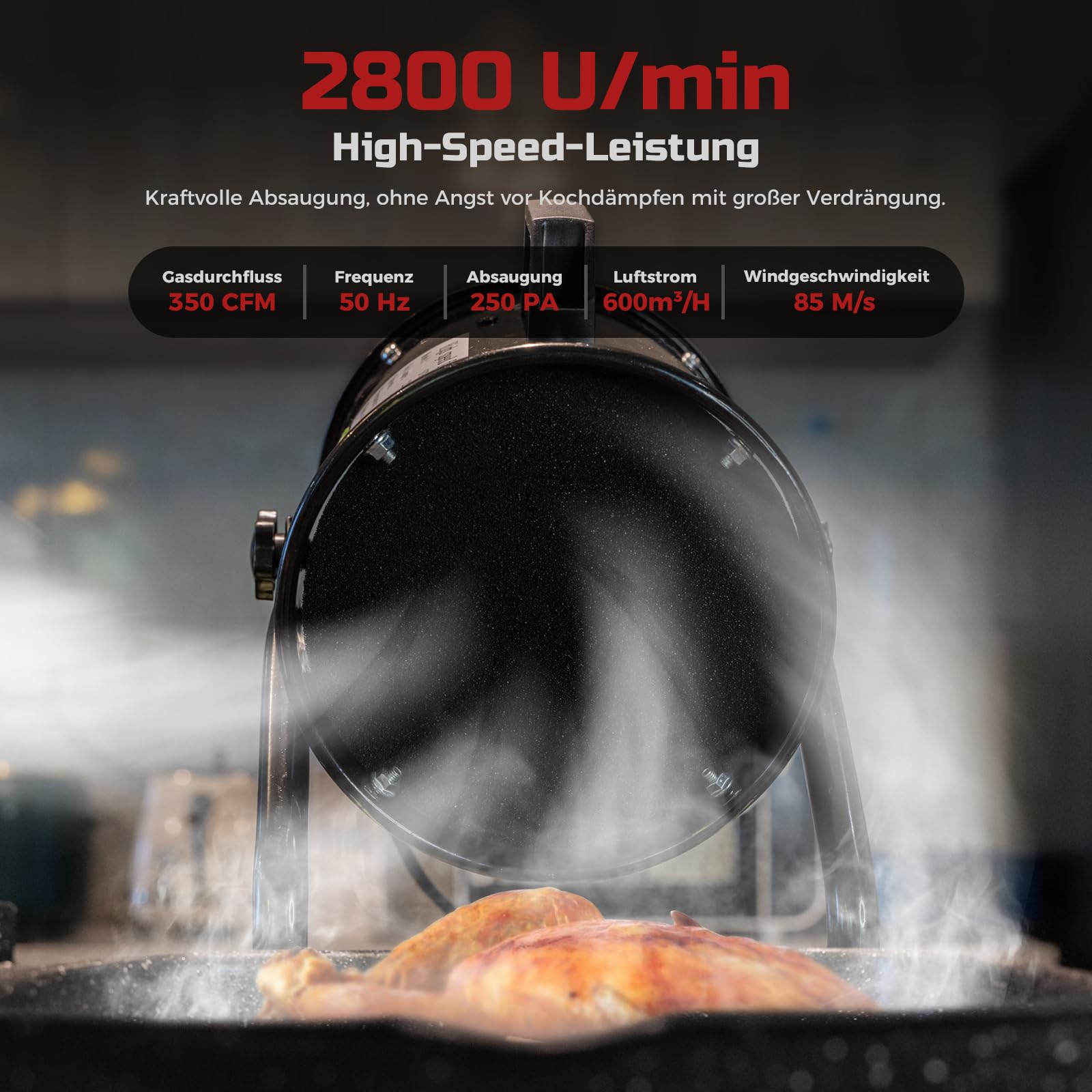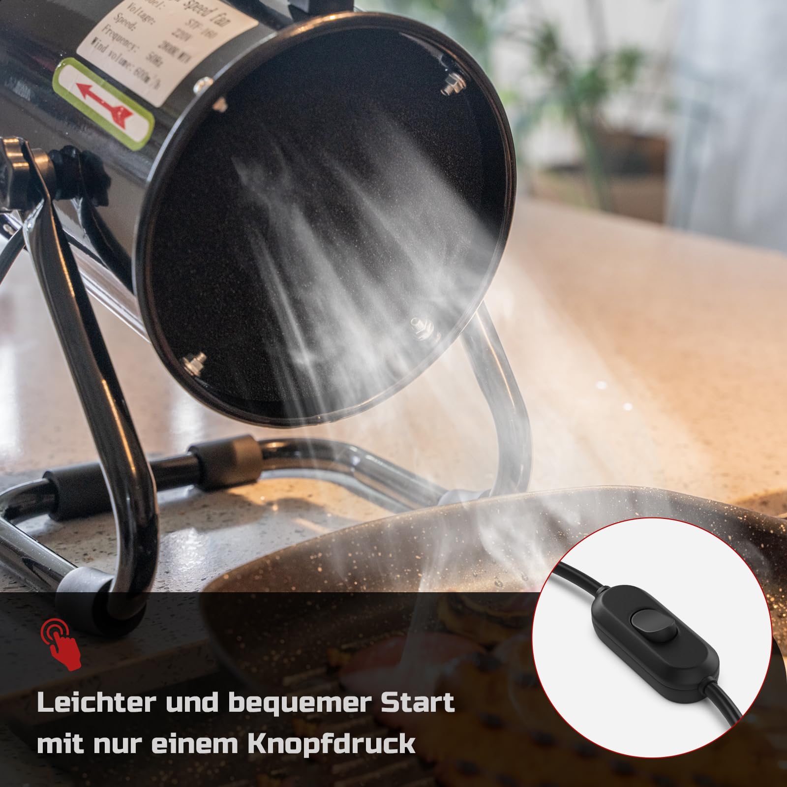 Mit einem kräftigen Luftstrom von 600 m³/h beseitigt sie effektiv Rauch und intensive Gerüche. Sie ist ideal für das Braten, Frittieren und Kochen von stark riechenden Speisen wie Fisch oder Fondue, besonders in Küchen ohne fest installierte Haube.