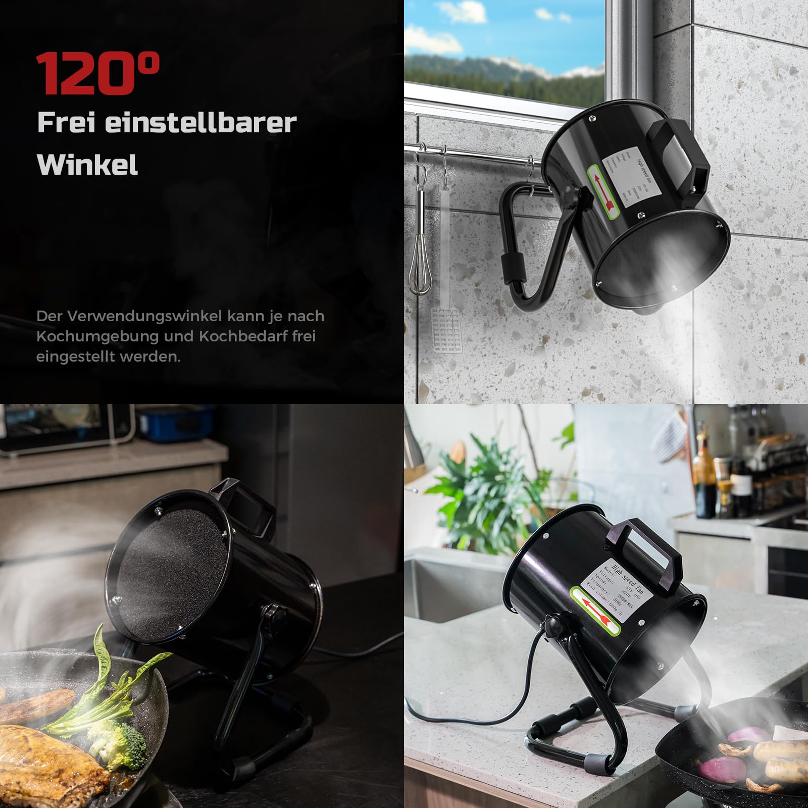 Ja, ein grosser Vorteil ist der flexibel einstellbare Ansaugwinkel. Sie können ihn um 120 Grad verstellen, um Rauch und Dampf direkt über dem Topf oder der Pfanne optimal zu erfassen und die Effizienz zu maximieren.