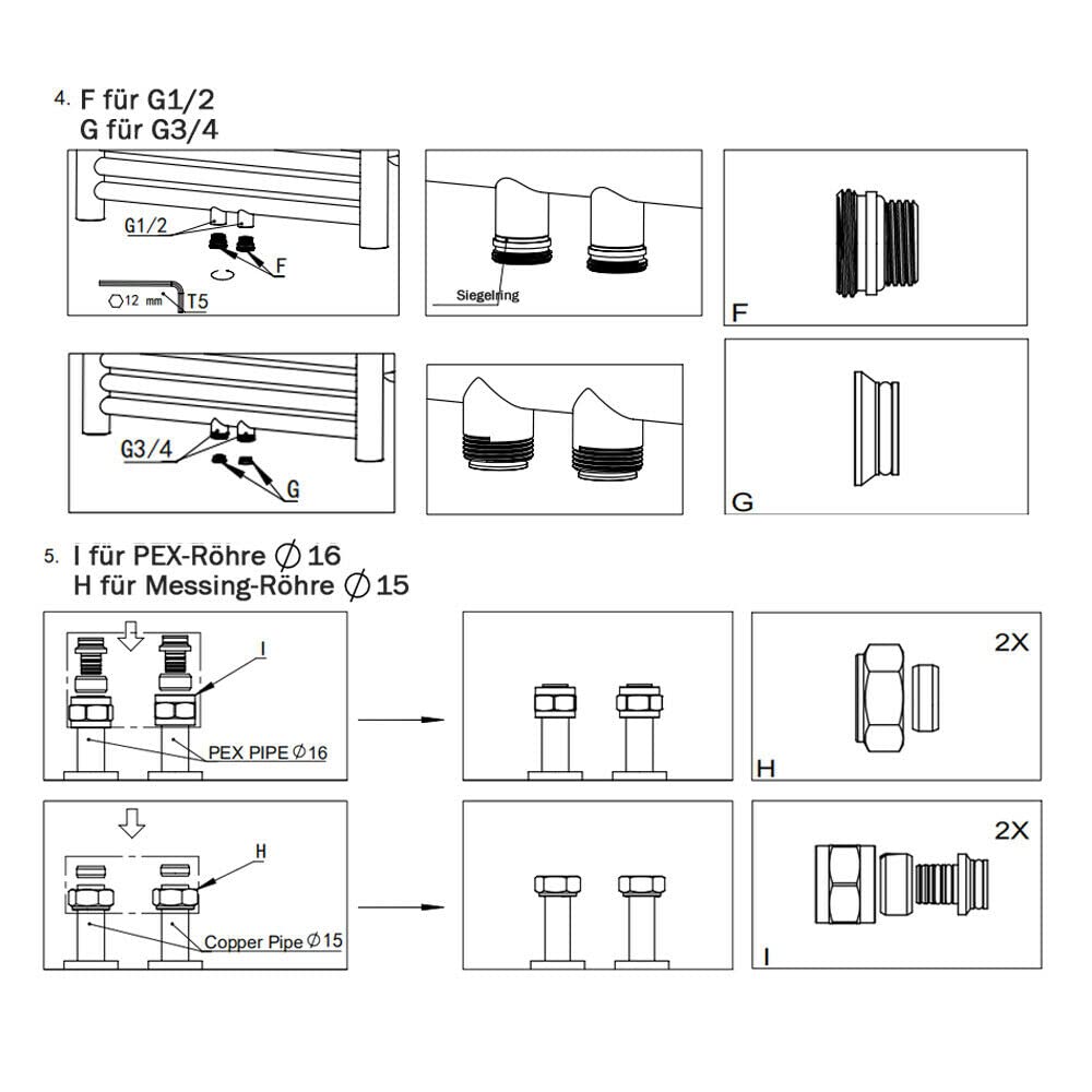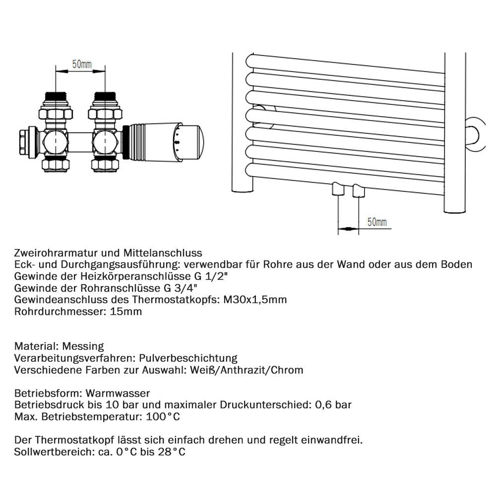 - Universelle Anschlüsse: Passend für alle gängigen Heizkörper mit G1/2" Innengewinde und Rohranschlüsse mit G3/4" Aussengewinde bei einem Standard-Nabenabstand von 50 mm.