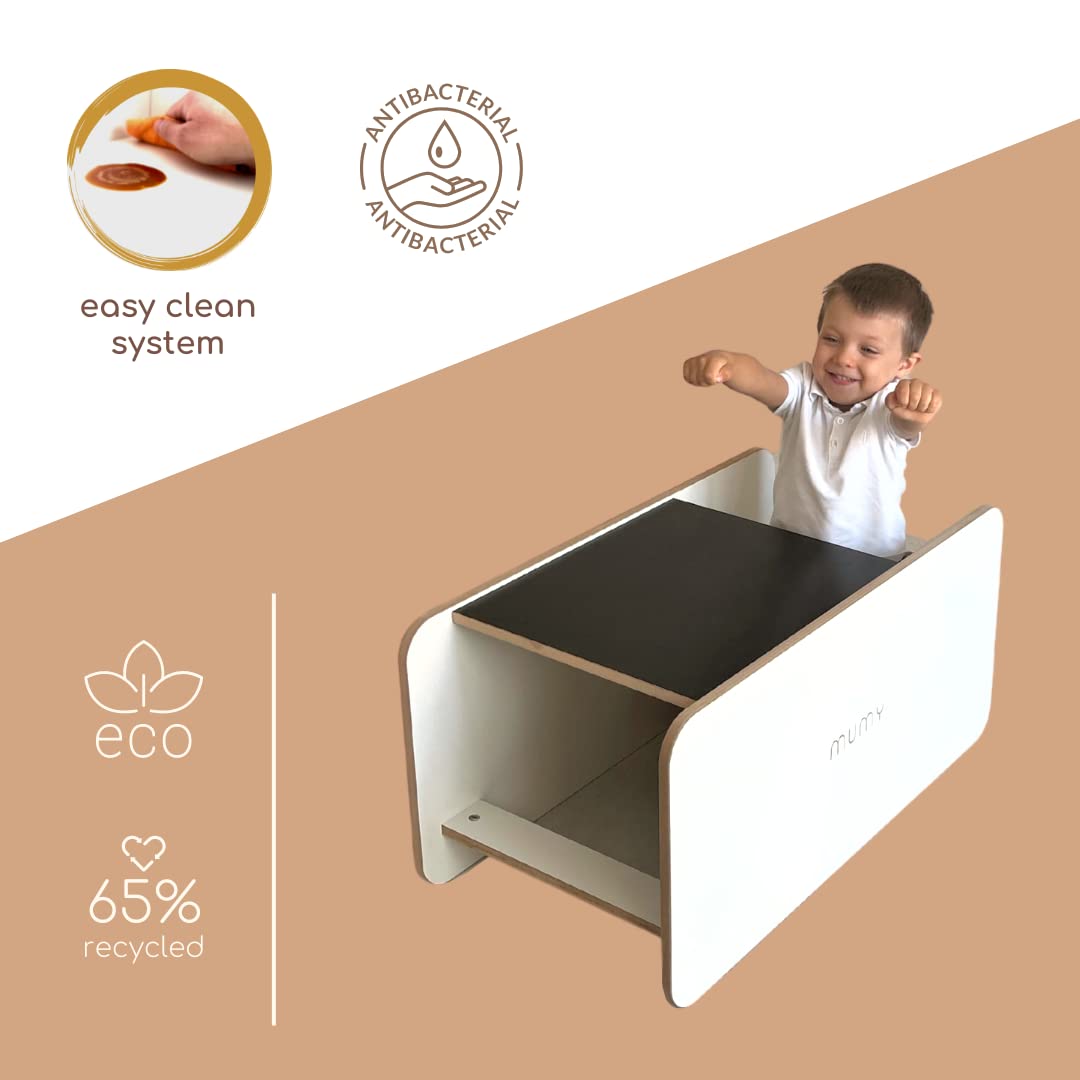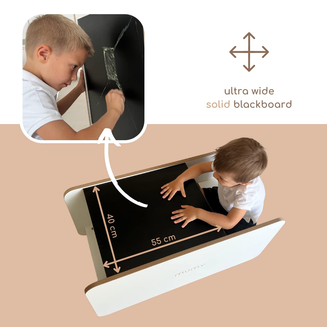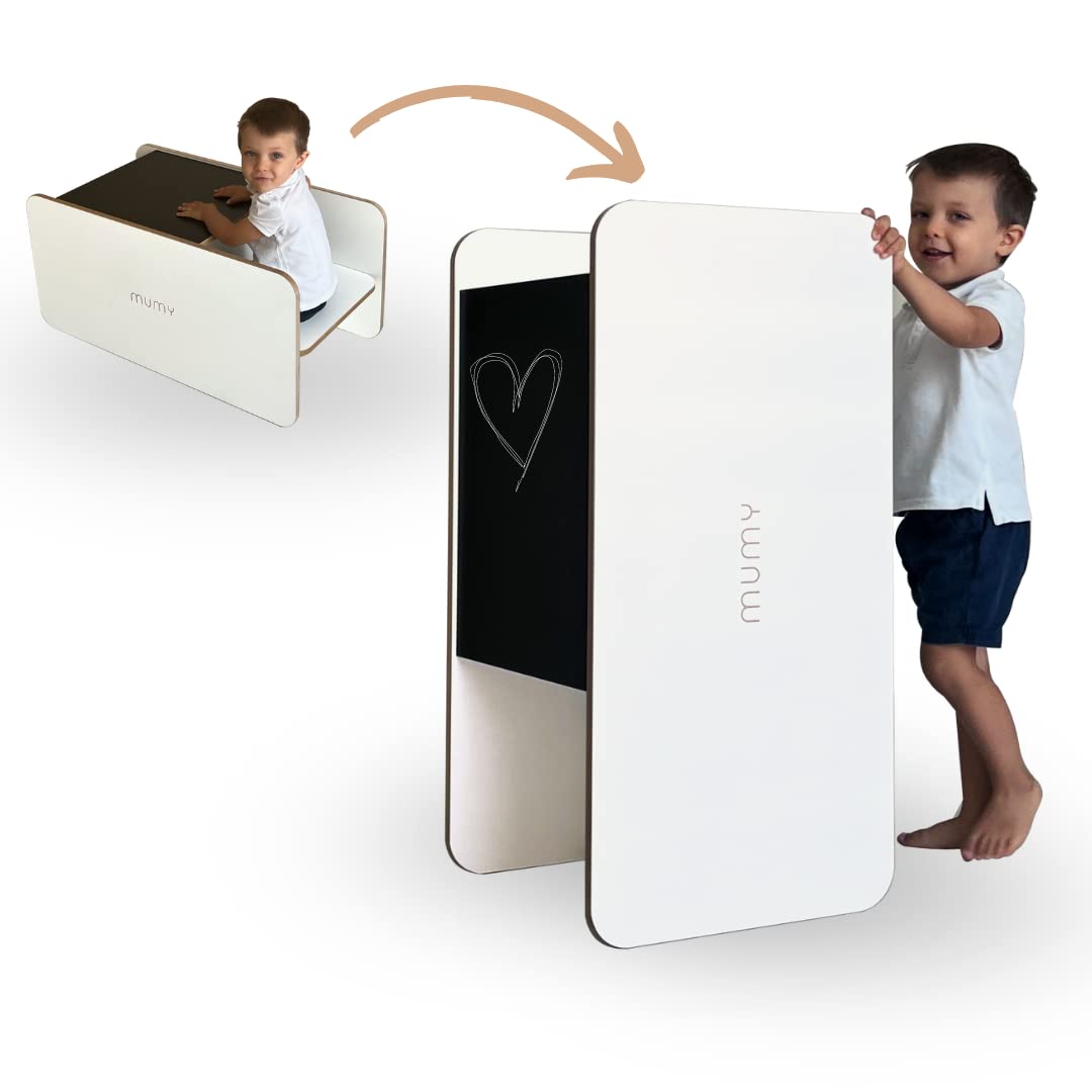 - Vielseitig und wandelbar: Verwandelt sich blitzschnell von einem sicheren Lernturm in einen praktischen Kinderschreibtisch mit grosser Tafelfläche. So begleitet er Ihr Kind bis zum Alter von fünf Jahren und passt sich flexibel den Phasen des Spielens, Malens und Lernens an.