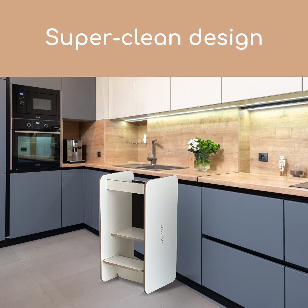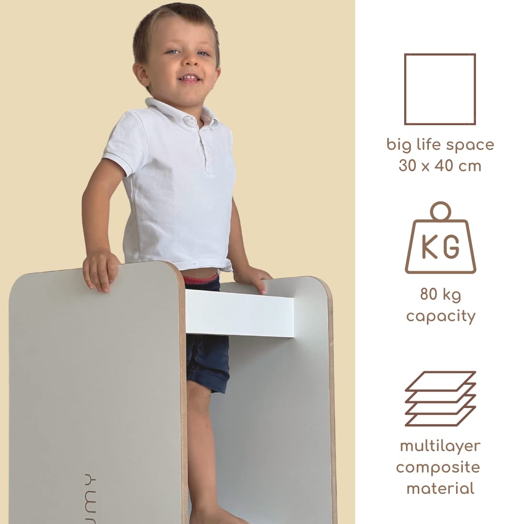 - Kompakt und mobil: Dank seiner durchdachten Grösse und des ausbalancierten Gewichts lässt sich der Lernturm spielend leicht in der Wohnung bewegen und genau dort platzieren, wo er gerade gebraucht wird.