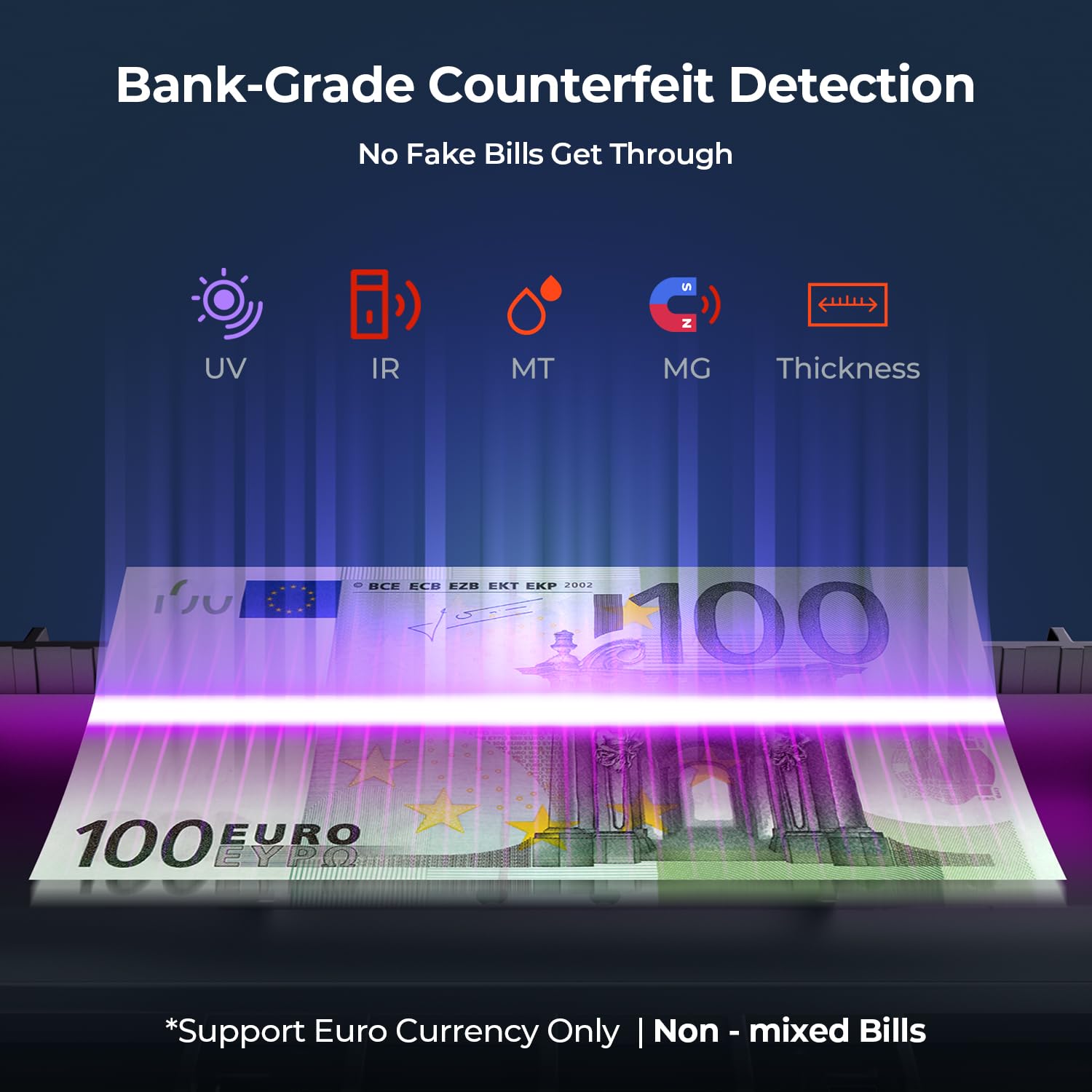 Die MUNBYN IMC51 ist speziell und ausschliesslich für das Zählen und Prüfen von Euro-Banknoten (EUR) konzipiert. Sie unterstützt keine anderen Währungen und kann auch keine Münzen zählen.