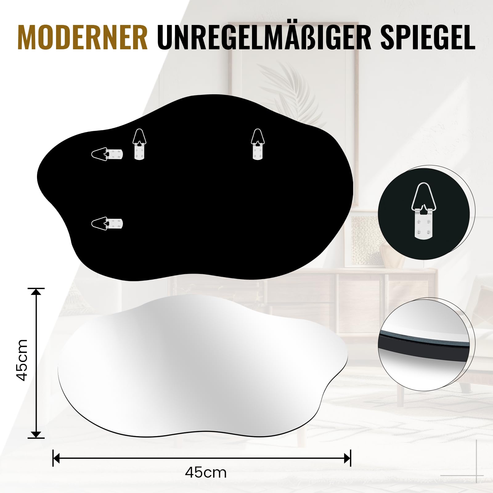 Dieser Spiegel ist ein Design-Statement. Er reflektiert Licht und lässt Räume dadurch optisch grösser, heller und einladender wirken. Seine unregelmässige, organische Form dient als moderner Kunstakzent und wird zum Blickfang in jedem Raum.