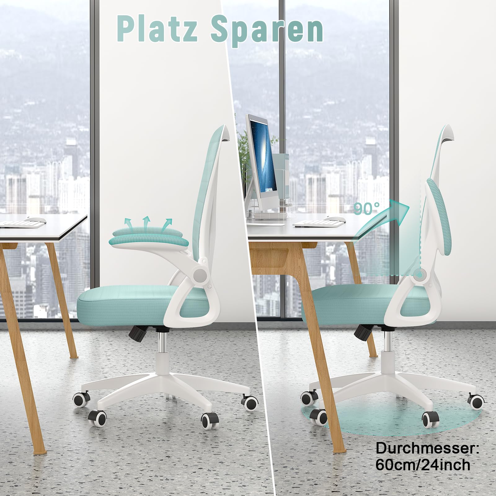 Die hochklappbaren Armlehnen sind besonders praktisch: Sie bieten bei Bedarf eine bequeme Ablage und lassen sich einfach nach oben schwenken, um den Stuhl nach getaner Arbeit vollständig und platzsparend unter dem Schreibtisch zu verstauen.