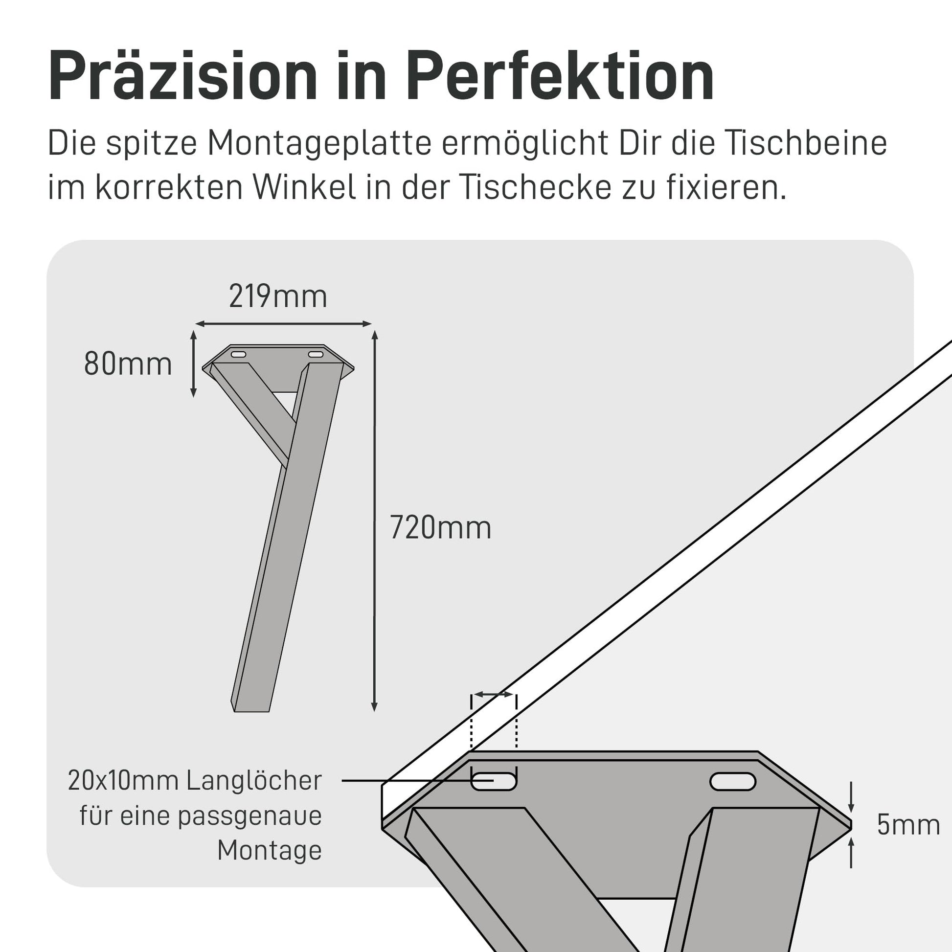 Dank der durchdachten Montageplatte mit vorgefertigten Langlöchern lassen sich diese Tischbeine einfach und spannungsfrei an nahezu jeder Tischplatte anbringen. Eine verständliche Anleitung unterstützt Sie bei der Installation. Die passenden Schrauben wählen Sie selbst, abgestimmt auf die Beschaffenheit Ihrer Platte, um optimalen Halt zu gewährleisten.