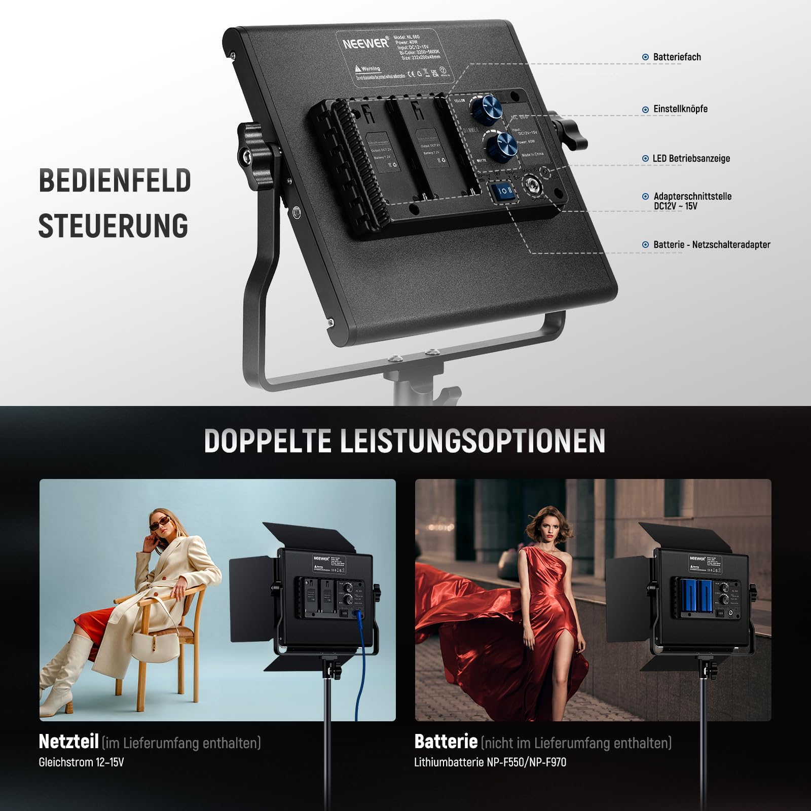- Flexible Stromversorgung: Betreiben Sie die Leuchten wahlweise über die mitgelieferten Netzteile für den Studioeinsatz oder mit separat erhältlichen NP-F Akkus für mobile Shootings.