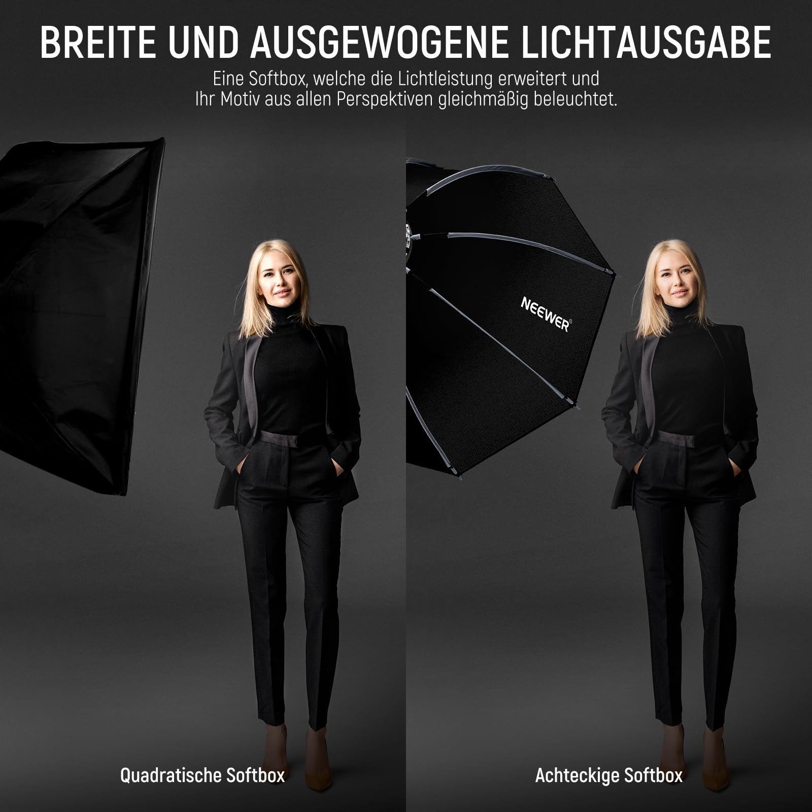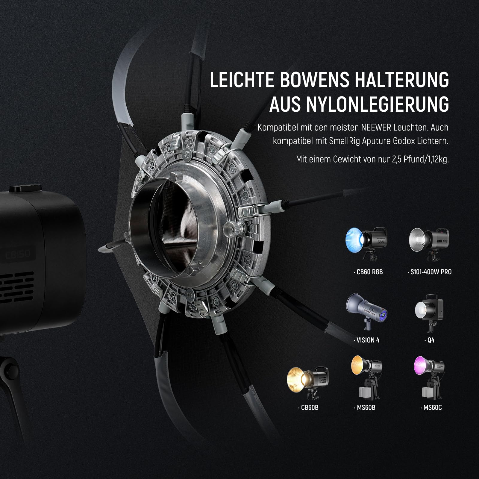 - Universeller Anschluss: Ausgestattet mit dem Standard Bowens-Mount für eine breite Kompatibilität mit zahlreichen Studioleuchten.