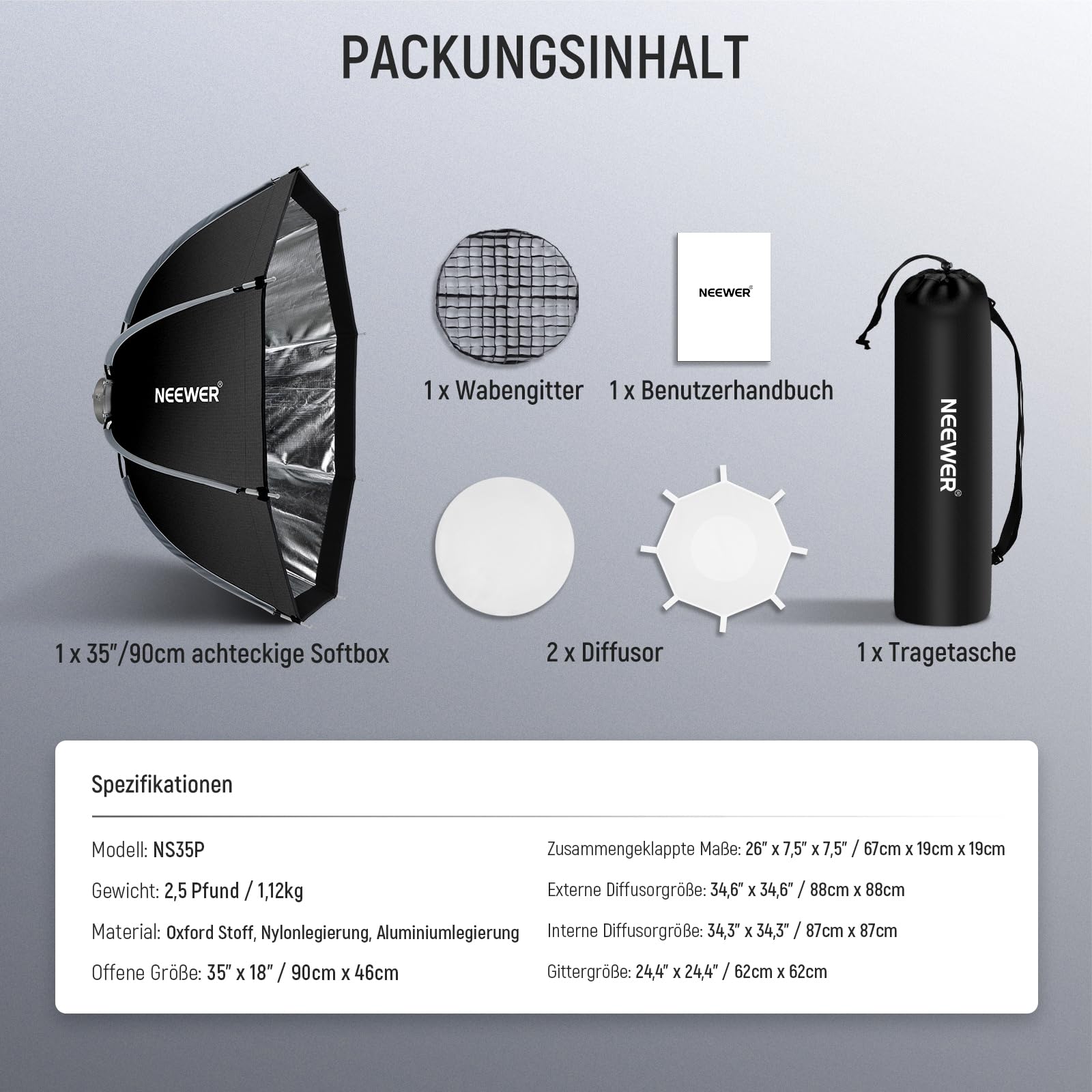 - Flexible Lichtsteuerung: Im Lieferumfang sind zwei Diffusoren (innen & aussen) sowie ein Wabengitter (Grid) enthalten, um das Licht von weich gestreut bis hart gerichtet zu formen.