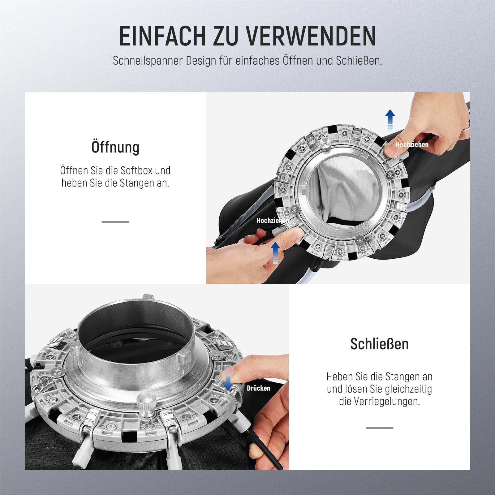 - Innovative Schnellmontage: Dank der integrierten Struktur lässt sich die Softbox in Sekundenschnelle auf- und wieder zuklappen – eine enorme Zeitersparnis gegenüber herkömmlichen Modellen.