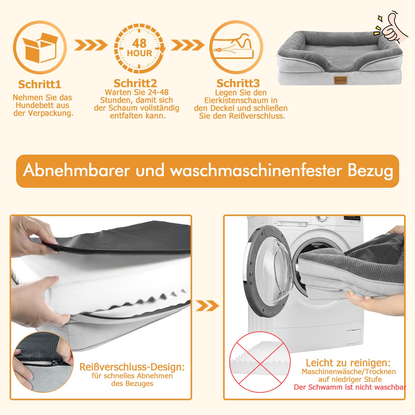 Das Hundebett wird vakuumiert geliefert. Bitte geben Sie ihm nach dem Auspacken mindestens 48 Stunden Zeit, um seine volle Grösse und Form zu entfalten. Um die passende Grösse sicherzustellen, messen Sie bitte vor dem Kauf die Körperlänge Ihres Hundes. Dieses Bett ist nicht für Hunde mit starkem Kauverhalten empfohlen.