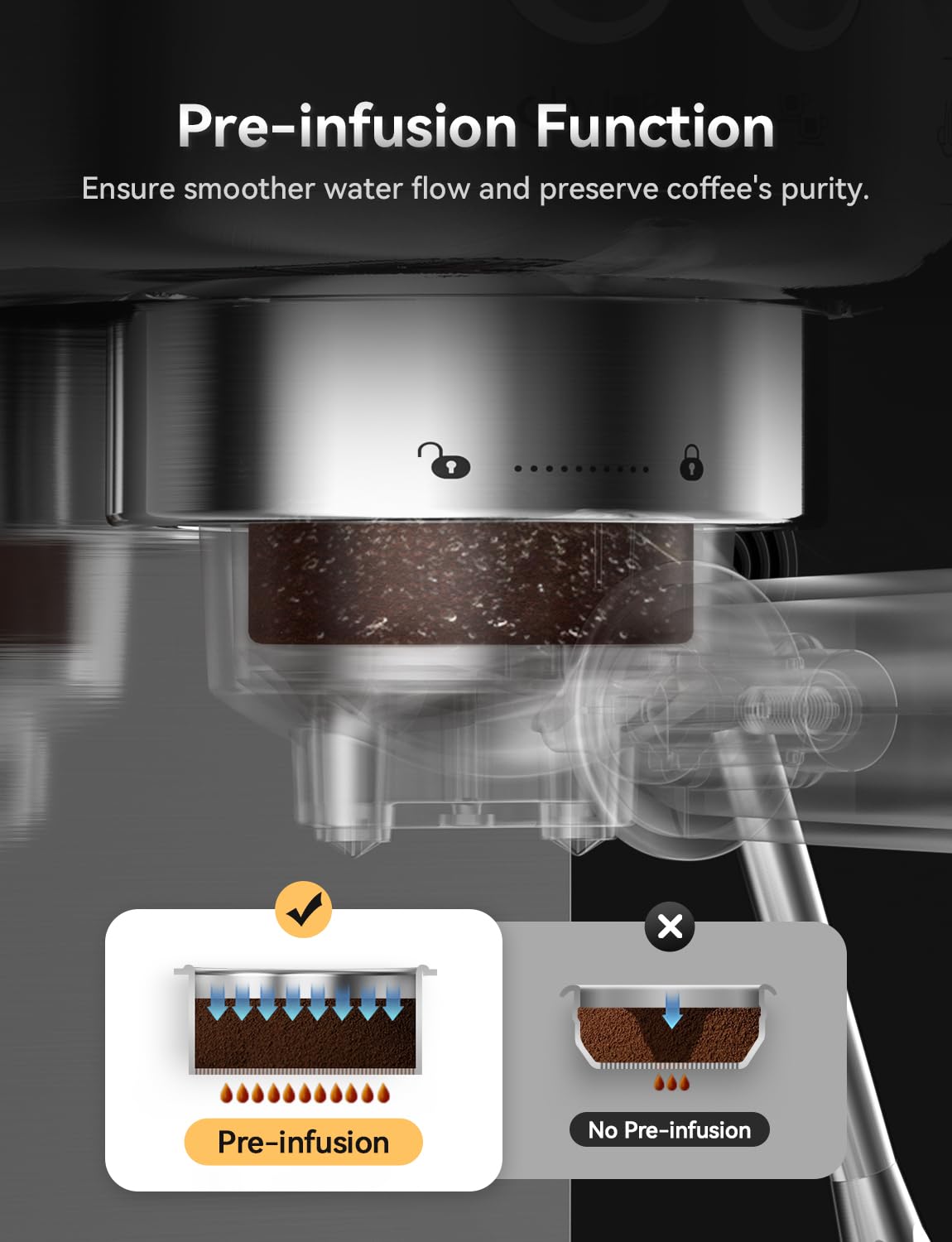 - Vorinfusions-Funktion: Befeuchtet das Kaffeepulver mit niedrigem Druck vor, was eine besonders gleichmässige Geschmacksentfaltung fördert.