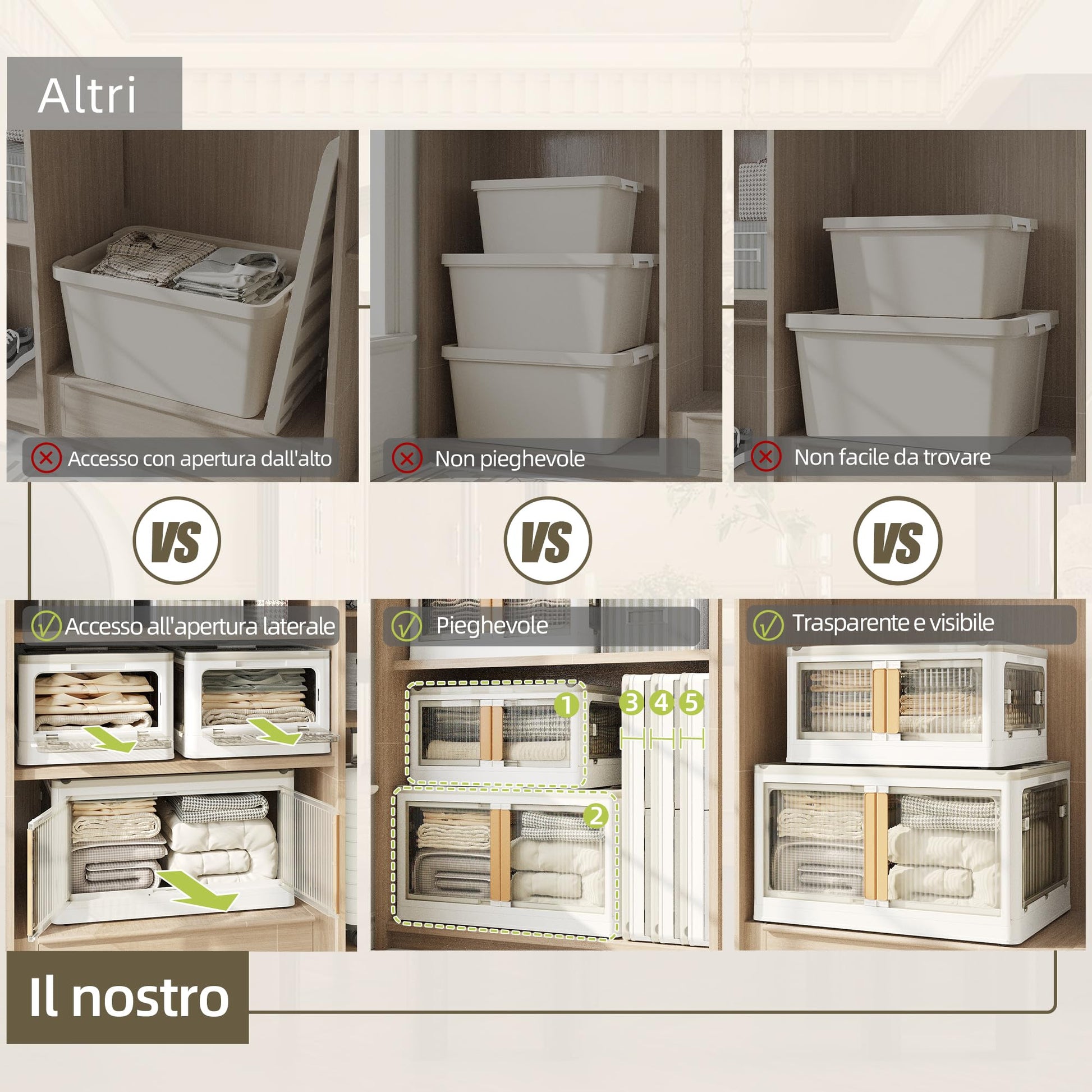 - Maximaler Zugriff: Die Boxen können von fünf Seiten geöffnet werden – von oben, vorne sowie von beiden Seiten. Dies ermöglicht einen bequemen Zugriff auf den Inhalt, ohne die Boxen umstapeln zu müssen.