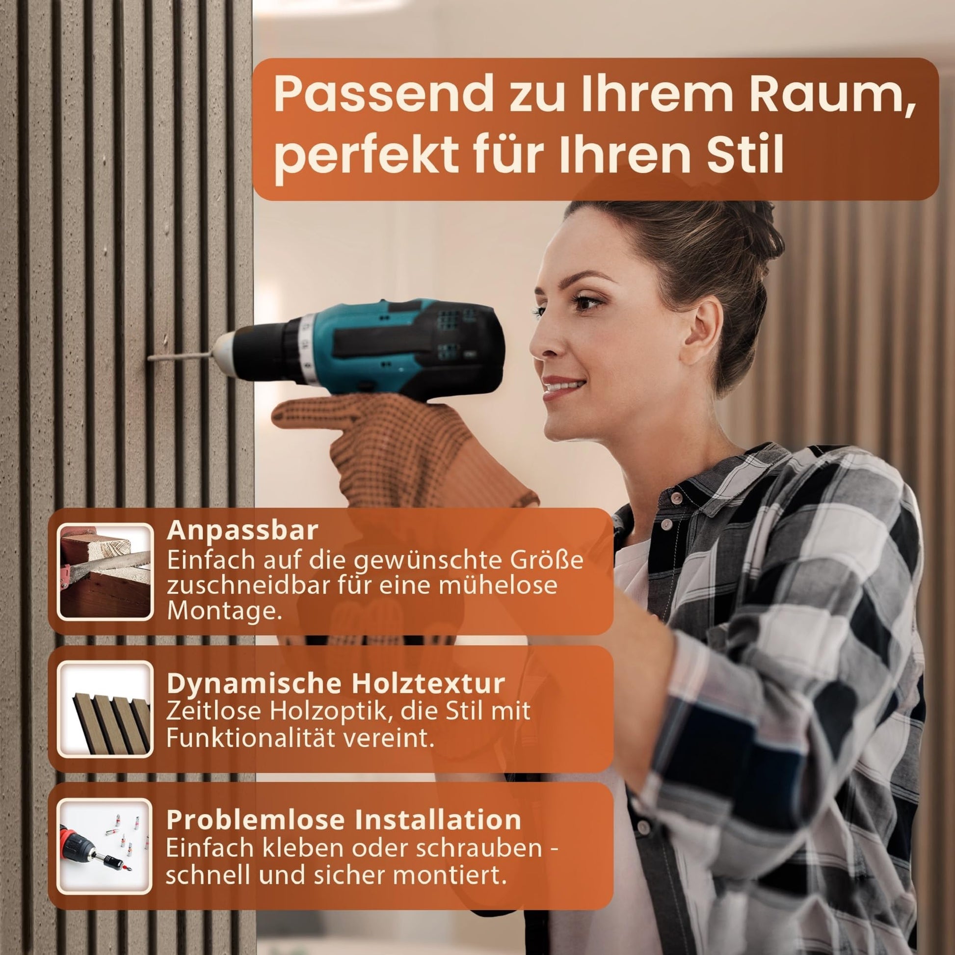 - Einfache Installation: Die Montage ist unkompliziert. Befestigen Sie die Paneele entweder mit Schrauben zwischen den Lamellen oder nutzen Sie Montagekleber für eine Anbringung ohne Bohrlöcher an Wand oder Decke.