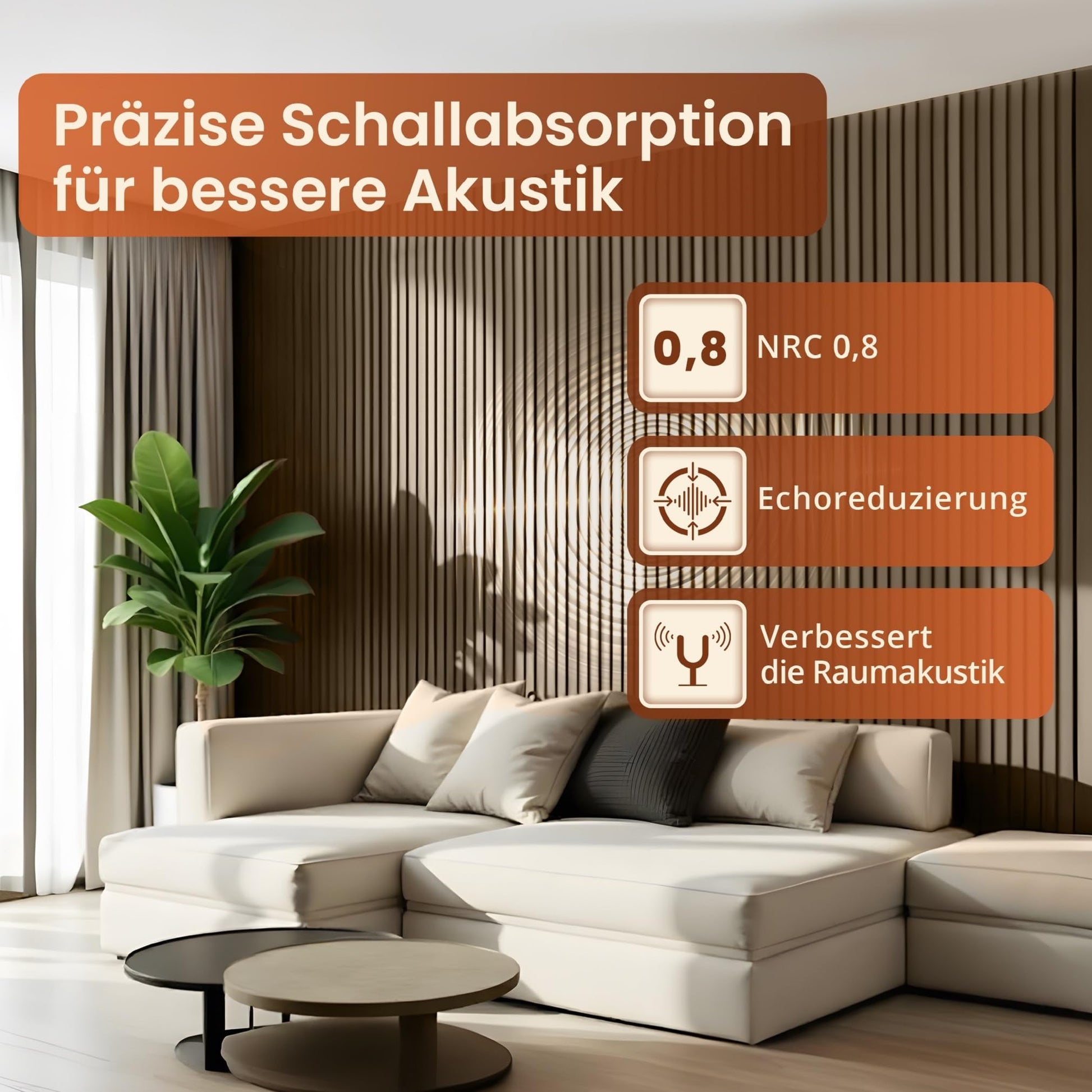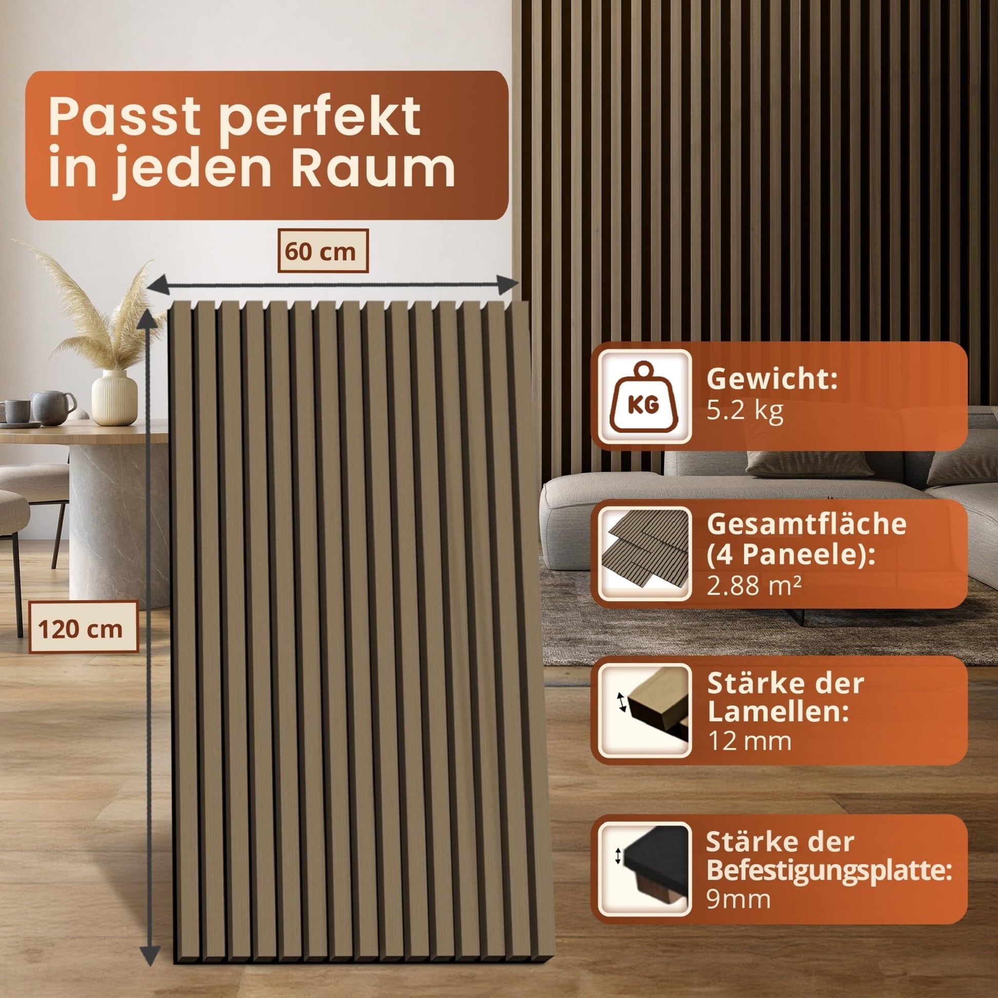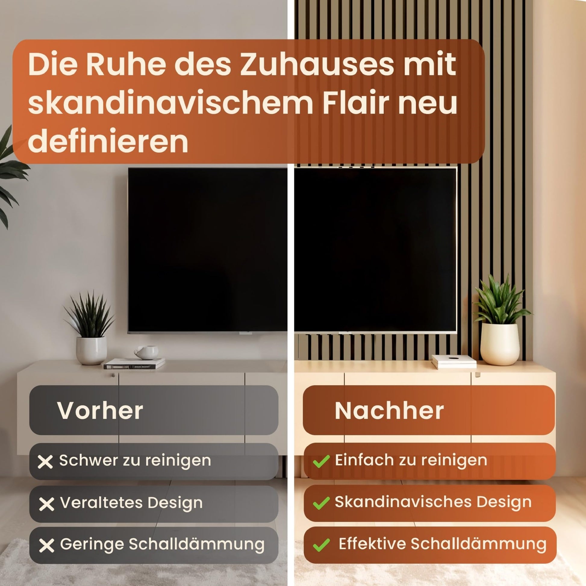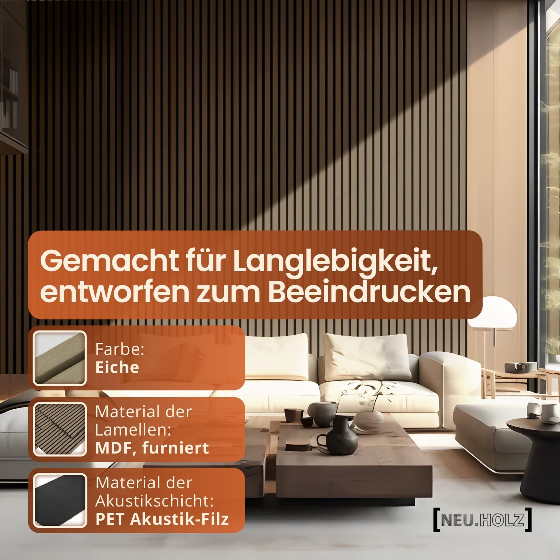 - Hochwertige Verarbeitung: Die Lamellenwand besteht aus robusten Holzlamellen auf einem langlebigen Akustikfilz, was eine lange Lebensdauer und einfache Pflege garantiert.