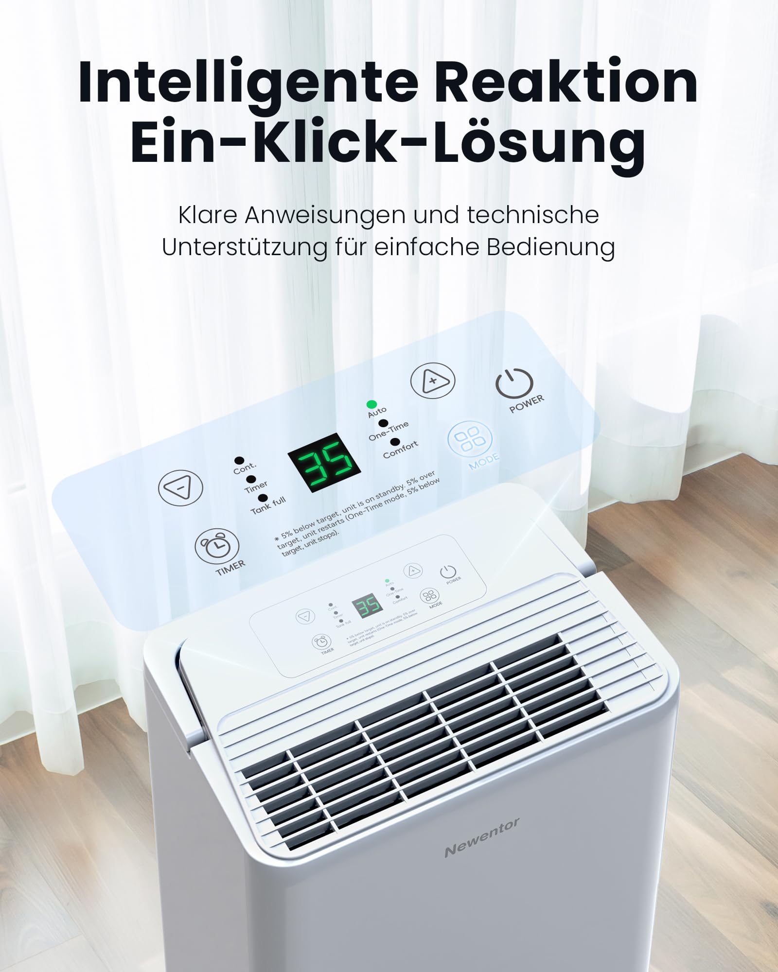 - Intelligenter Automatik-Modus: Ein exklusiver Modus reguliert die Luftfeuchtigkeit selbstständig, schaltet sich bei Erreichen des Zielwerts ab und spart so bis zu 20 % Energie.