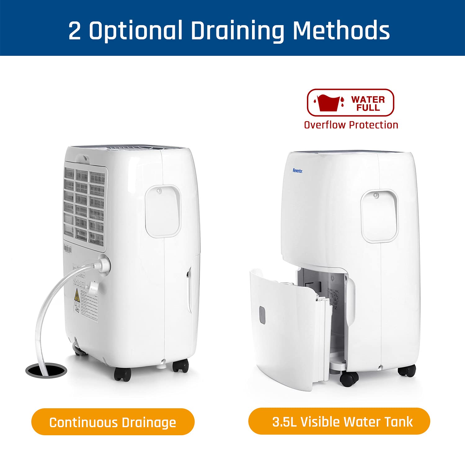 - Flexible Entwässerung: Integrierter 3,5-Liter-Wassertank mit automatischer Abschaltung oder kontinuierlicher Betrieb über den mitgelieferten 2-Meter-Ablaufschlauch.