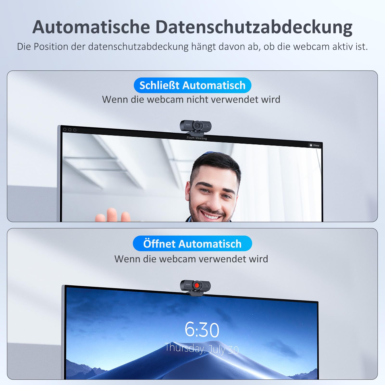 Die elektronische Abdeckung bietet intelligenten Schutz für Ihre Privatsphäre. Sie öffnet sich automatisch, wenn eine Video-App wie Zoom oder Teams startet, und schliesst sich wieder, wenn der Anruf beendet ist. So können Sie sicher sein, dass niemand unbeobachtet zusieht.