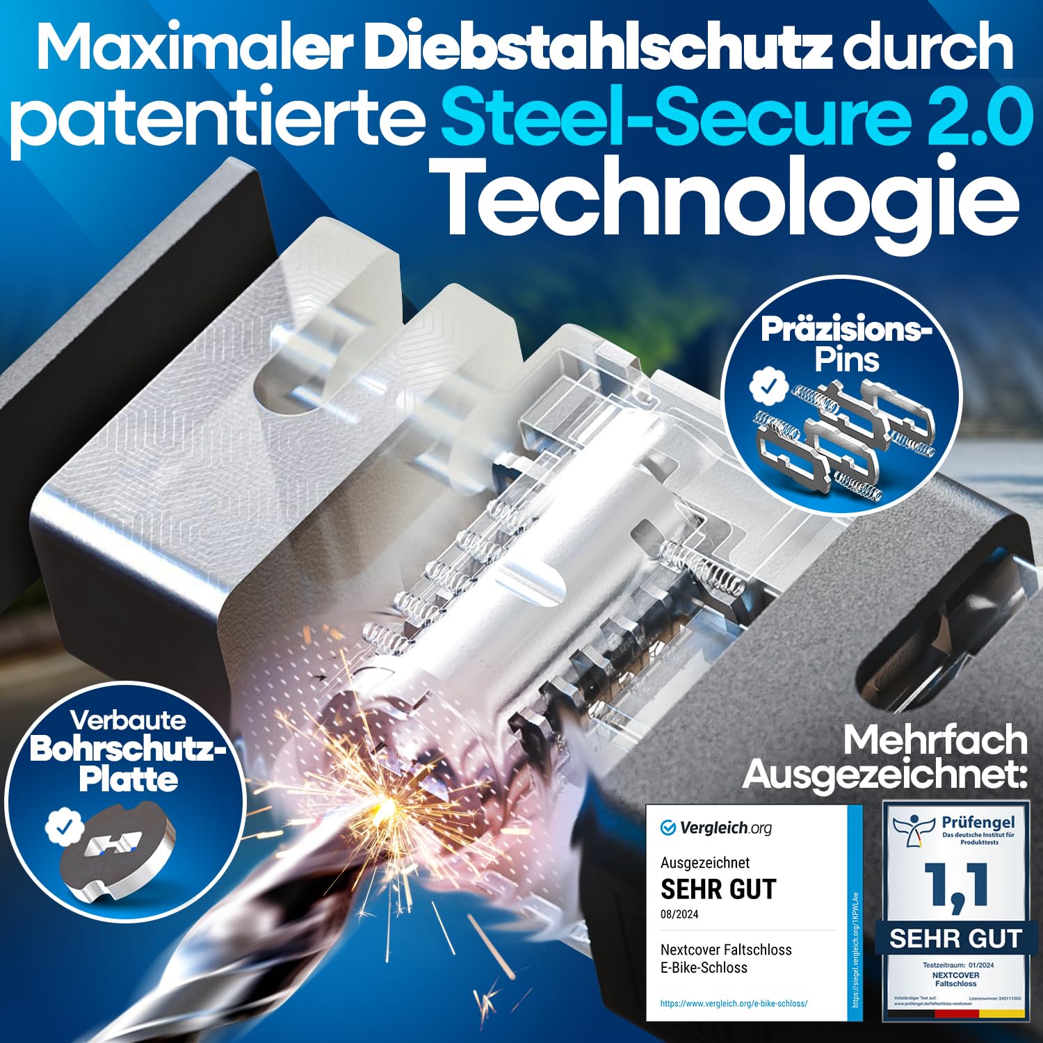 Das Schloss bietet eine sehr hohe Sicherheit. Dank der fortschrittlichen SteelSecure-Technologie aus gehärtetem Carbonstahl und einer speziellen Bohrschutzplatte ist es extrem schwierig, das Schloss aufzubrechen oder zu manipulieren, was einen kompromisslosen Schutz vor Diebstahl gewährleistet.