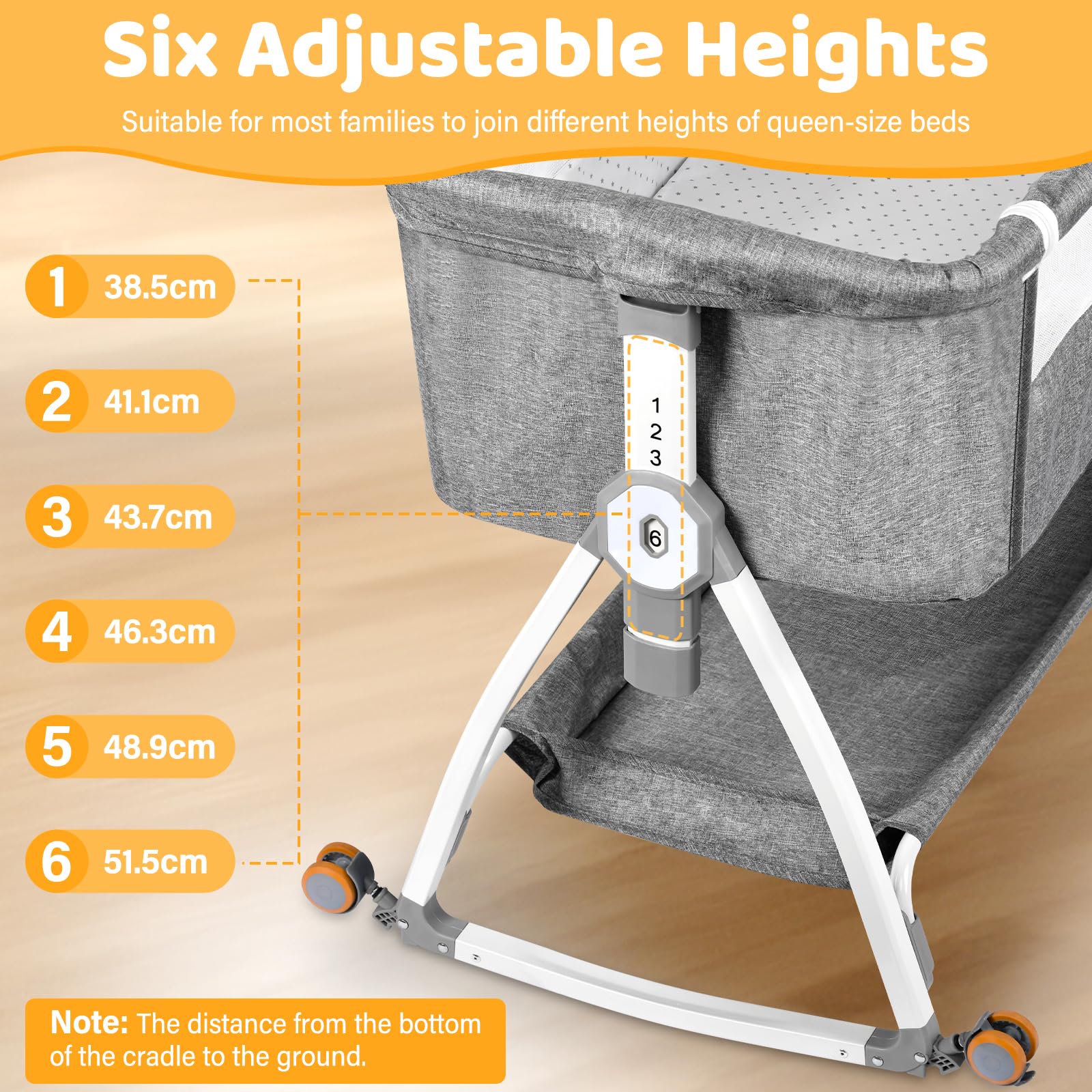 Das Babybett verfügt über eine 6-stufige Höhenverstellung, mit der die Liegefläche von 35,5 cm bis 51,5 cm angepasst werden kann. So lässt es sich nahtlos an die Höhe der meisten gängigen Elternbetten angleichen.