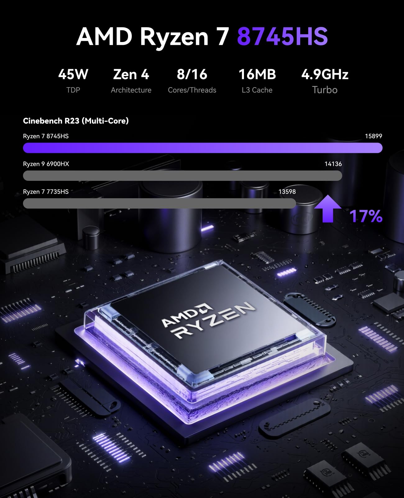 - Leistungsstarker Prozessor: Ausgestattet mit einem AMD Ryzen 7 8745HS Prozessor (8 Kerne/16 Threads, bis 4,9 GHz) auf Basis der fortschrittlichen 4-nm-Zen4-Architektur für überragende Performance.