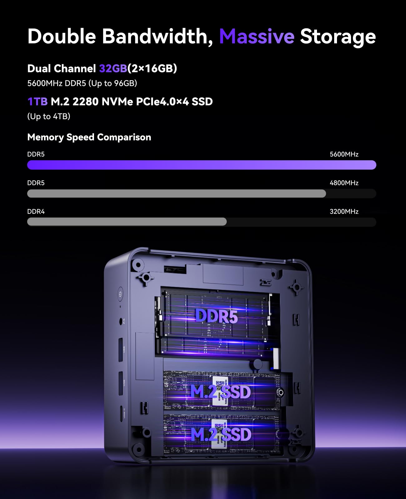 Der Mini-PC ist für ein ruhiges Arbeitsumfeld optimiert. Sein durchdachtes Kühlsystem sorgt dafür, dass die Lautstärke auch unter Volllast unter 38 dB bleibt. Dank seines ultrakompakten Designs passt er auf jeden Schreibtisch und kann mit einer VESA-Halterung sogar unsichtbar hinter einem Monitor montiert werden.