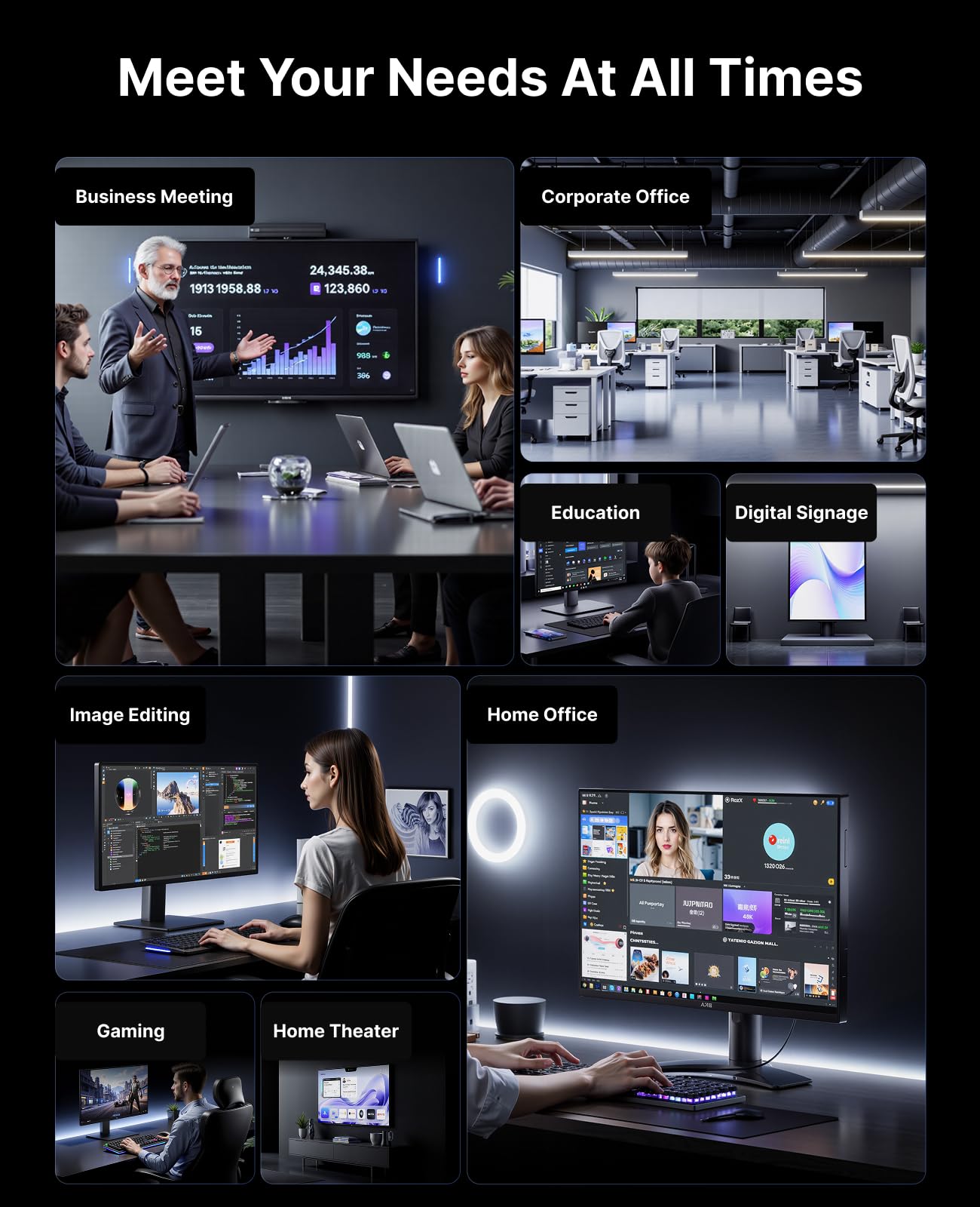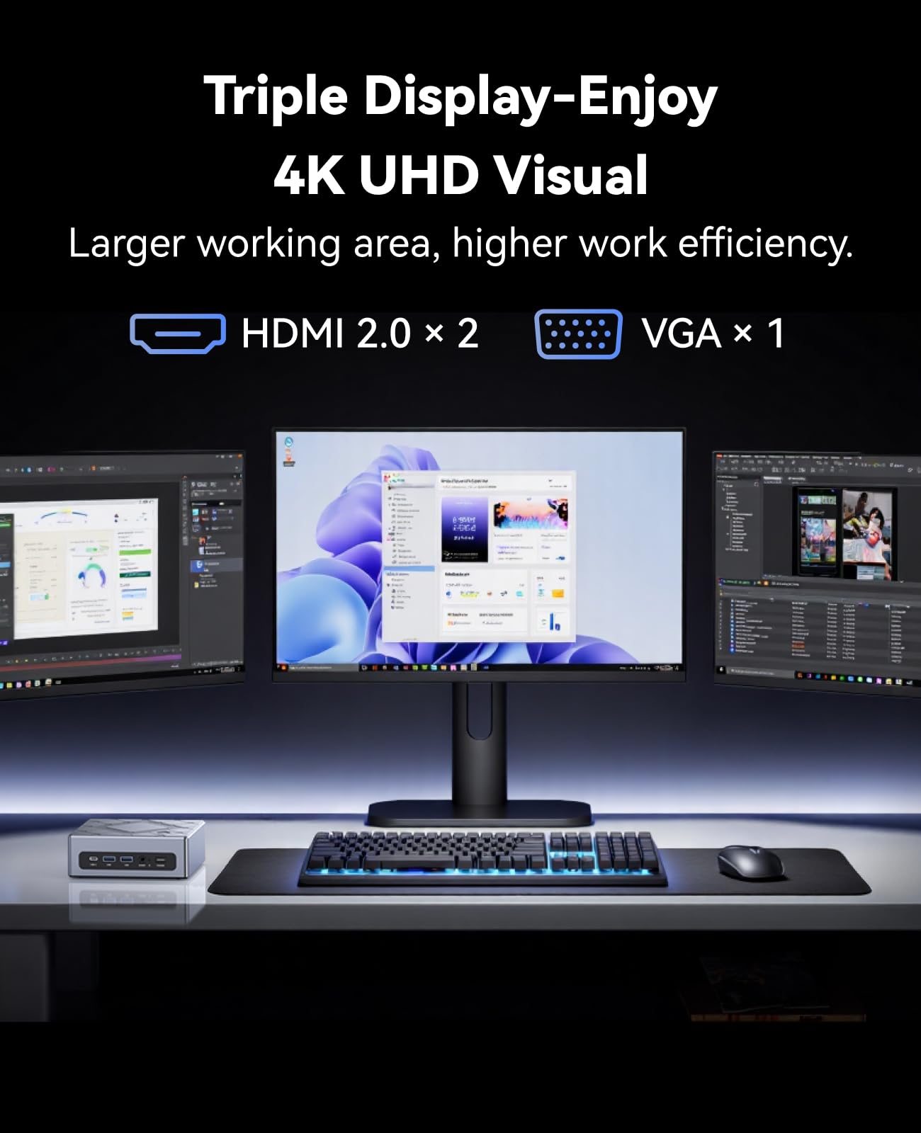 Sie können bis zu drei Bildschirme gleichzeitig anschliessen. Der Mini-PC verfügt über zwei HDMI-Anschlüsse und einen VGA-Anschluss und unterstützt eine gestochen scharfe 4K-Auflösung, ideal für eine erweiterte Arbeitsfläche oder ein beeindruckendes Heimkino-Erlebnis.