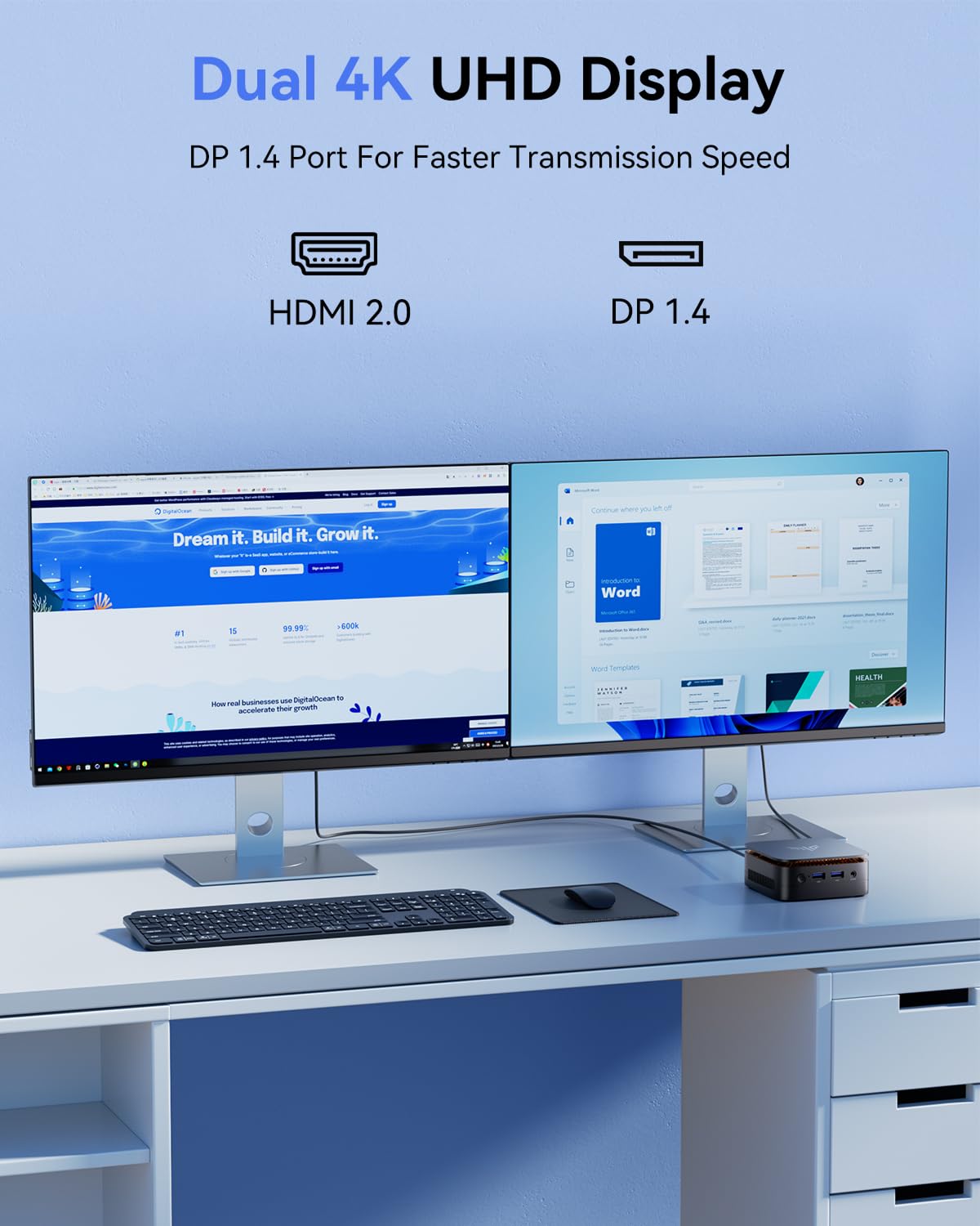 Ja, absolut. Der Mini-PC ist für maximale Produktivität ausgelegt und unterstützt den gleichzeitigen Anschluss von zwei Bildschirmen mit einer gestochen scharfen Auflösung von bis zu 4K bei 60Hz. Hierfür stehen Ihnen ein HDMI-Anschluss und ein DisplayPort 1.4 zur Verfügung.