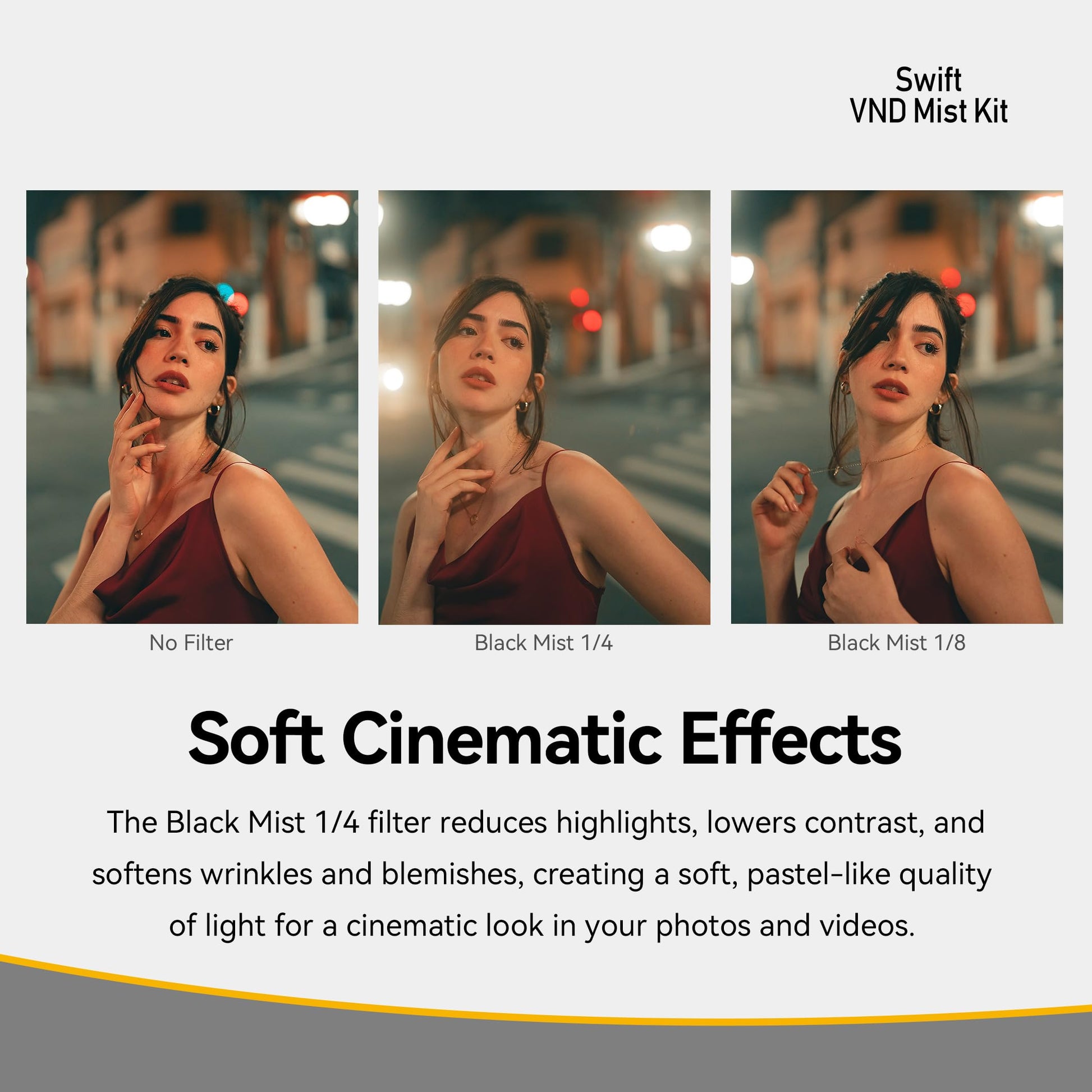 Verleihen Sie Ihren Aufnahmen mit dem Black Mist Filter einen professionellen, filmischen Charakter. Er erzeugt sanfte, schmeichelhafte Hauttöne, kontrolliert harte Spitzlichter und schafft eine subtile, atmosphärische Tiefe in Ihren Bildern und Videos.