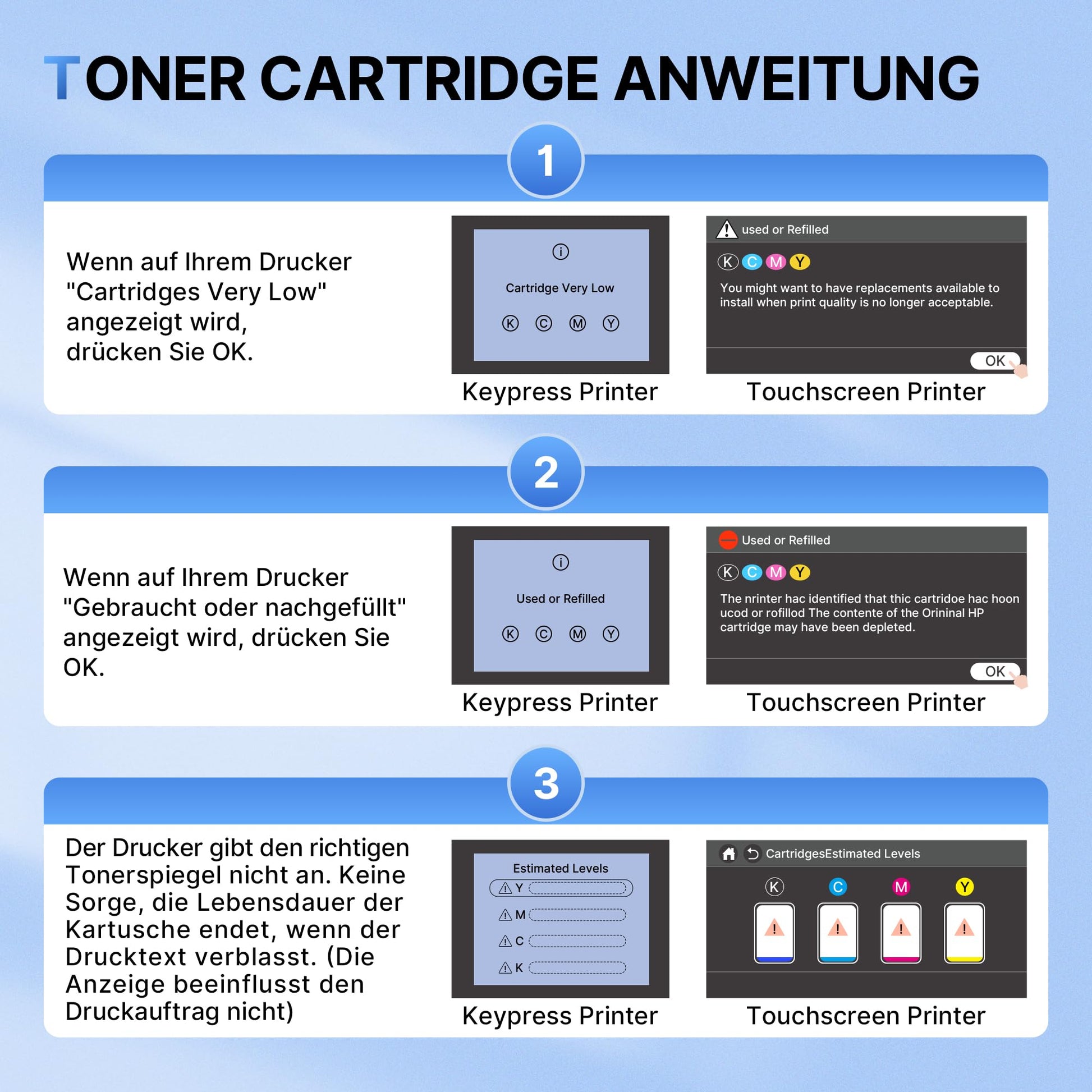 Nein, da der Chip von Ihrer alten Kartusche übernommen wird, zeigt der Drucker wahrscheinlich weiterhin einen niedrigen oder leeren Füllstand an. Sie können diese Meldung einfach ignorieren und normal weiterdrucken, bis die Druckqualität nachlässt.