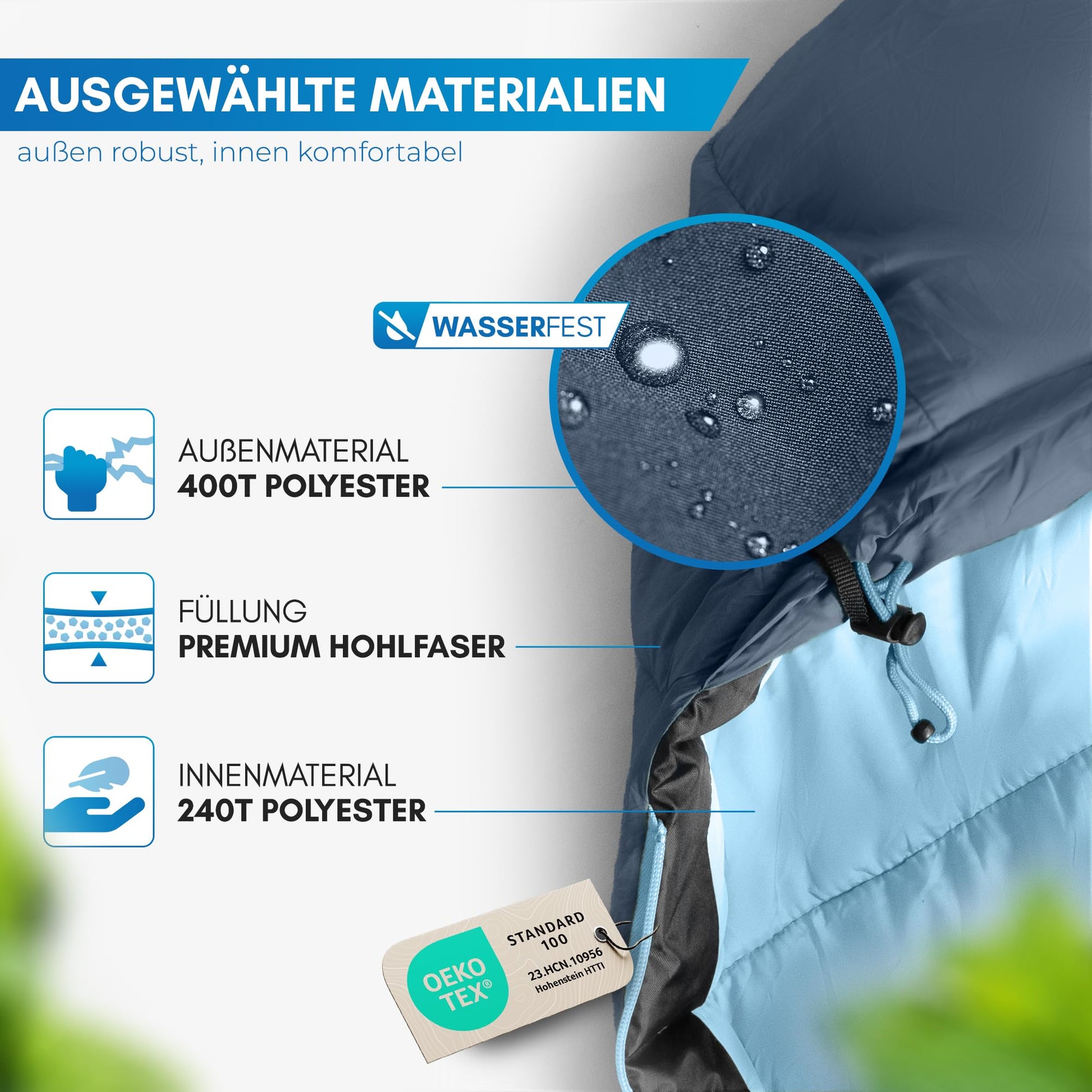 Robust und zuverlässig: Verlassen Sie sich auf eine lange Lebensdauer. Das strapazierfähige und atmungsaktive Polyester macht den Schlafsack äusserst langlebig. Eine zusätzliche wasserabweisende Beschichtung schützt Sie zuverlässig vor Feuchtigkeit von aussen.
