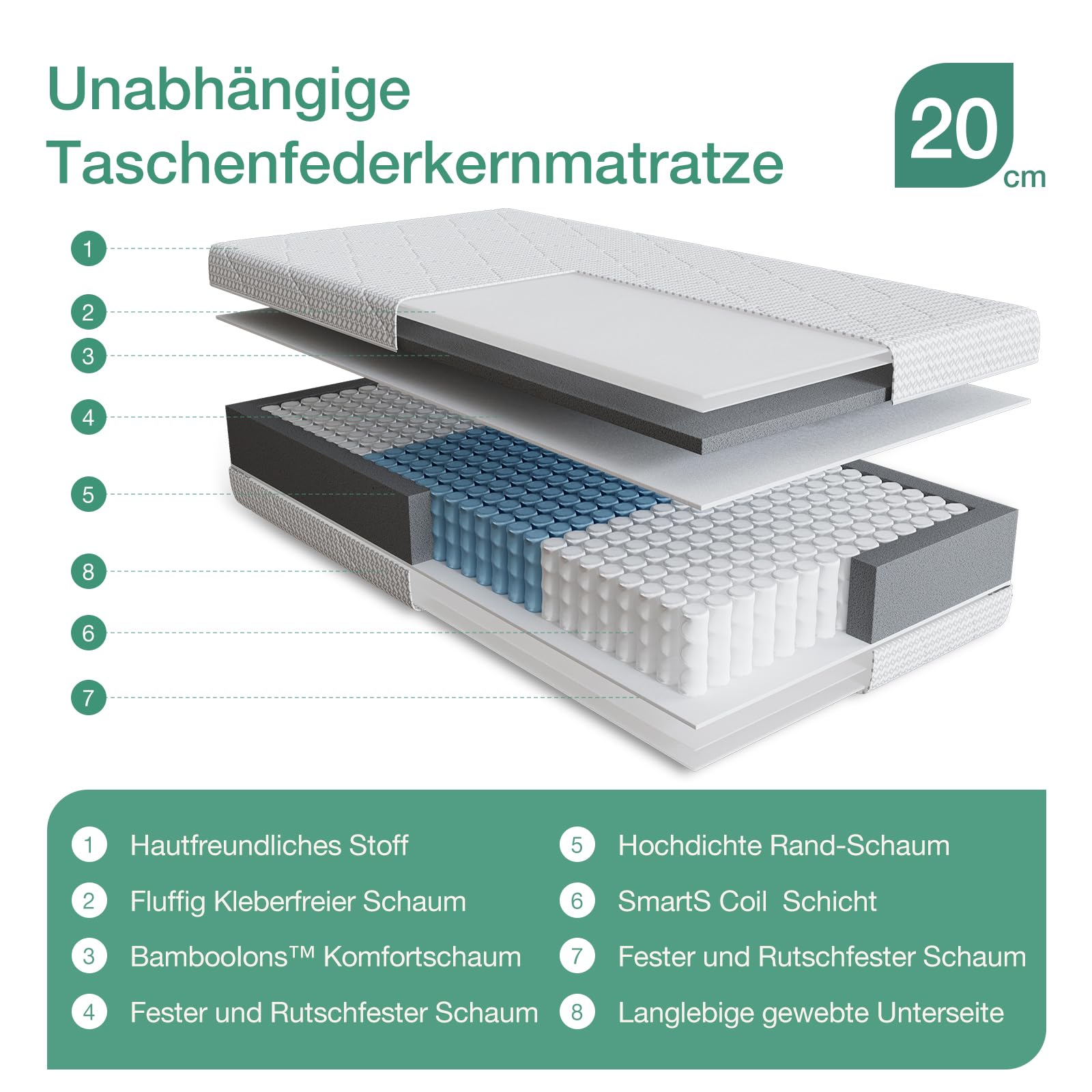 - 7-Zonen-Tonnentaschenfederkern: Bietet eine punktgenaue Entlastung für jede Körperpartie und fördert eine ergonomisch korrekte Schlafposition.