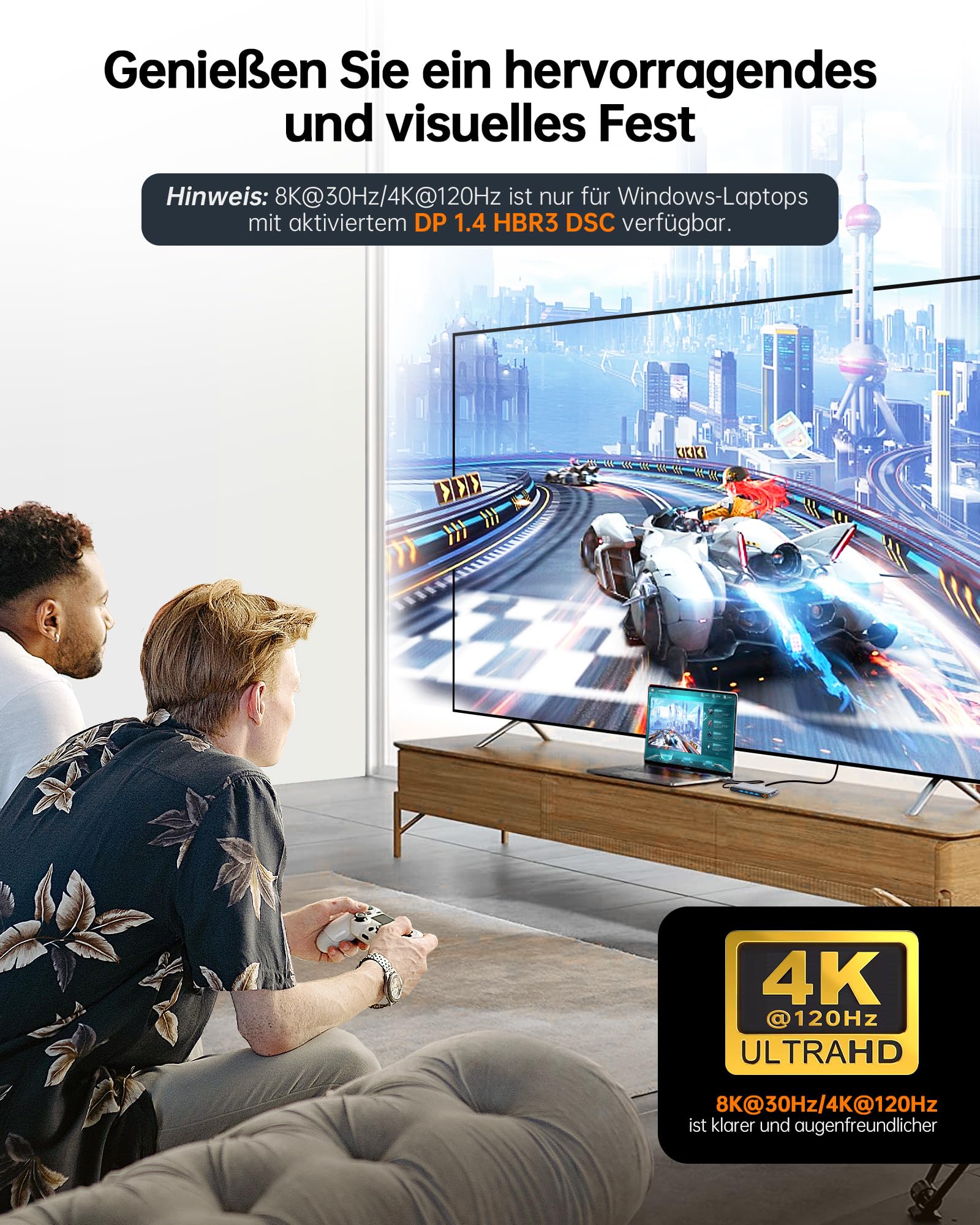 Der DisplayPort-Anschluss allein unterstützt bis zu 8K@30Hz oder 4K@120Hz. Wenn Sie mehrere Monitore gleichzeitig anschliessen, wird die Bandbreite aufgeteilt. Für ein Setup mit vier Monitoren auf einem Windows-PC sind typischerweise Konfigurationen wie 1x 4K@30Hz + 2x 1080p@60Hz + 1x 1080p@60Hz möglich. Die genauen Auflösungen hängen von der Leistungsfähigkeit Ihres Laptops ab.