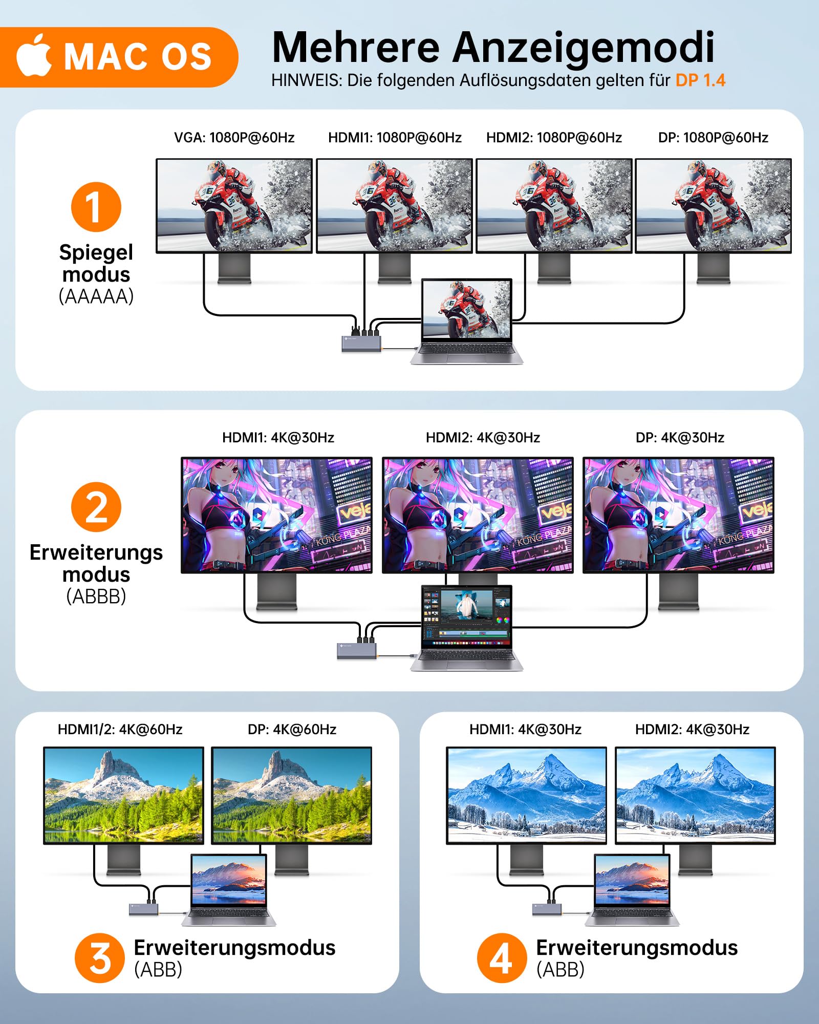 - macOS Kompatibilität: Apple Laptops (macOS) unterstützen den MST-Modus (Multi-Stream Transport) nicht. Das bedeutet, dass alle angeschlossenen externen Monitore den gleichen Inhalt anzeigen (Spiegel-Modus) und nicht als unabhängige Desktops erweitert werden können.