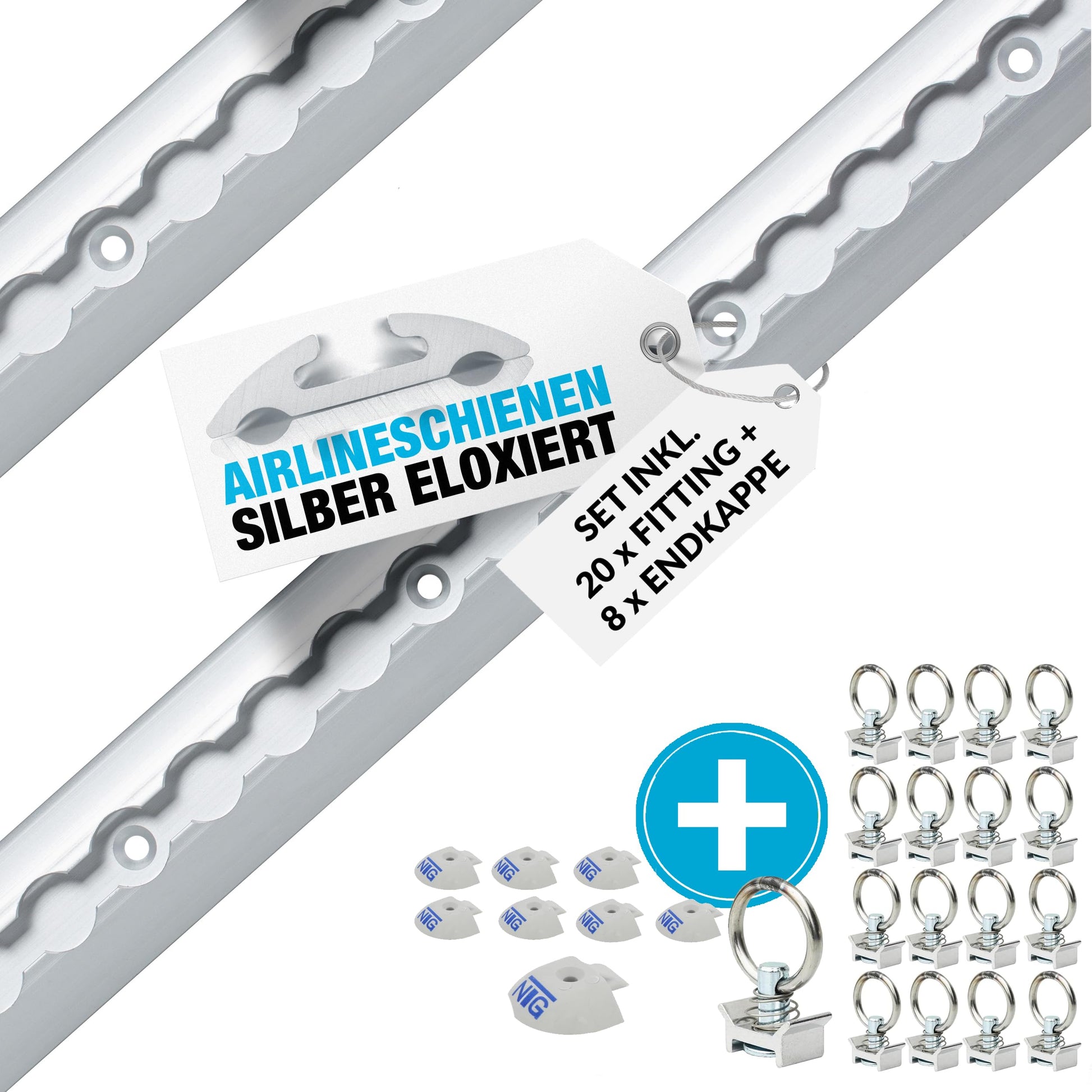 - Komplett-Set: Beinhaltet vier halbrunde Airlineschienen (je 1975 mm), 20 Single-Stud-Fittings aus Aluminium und acht passende Endkappen.