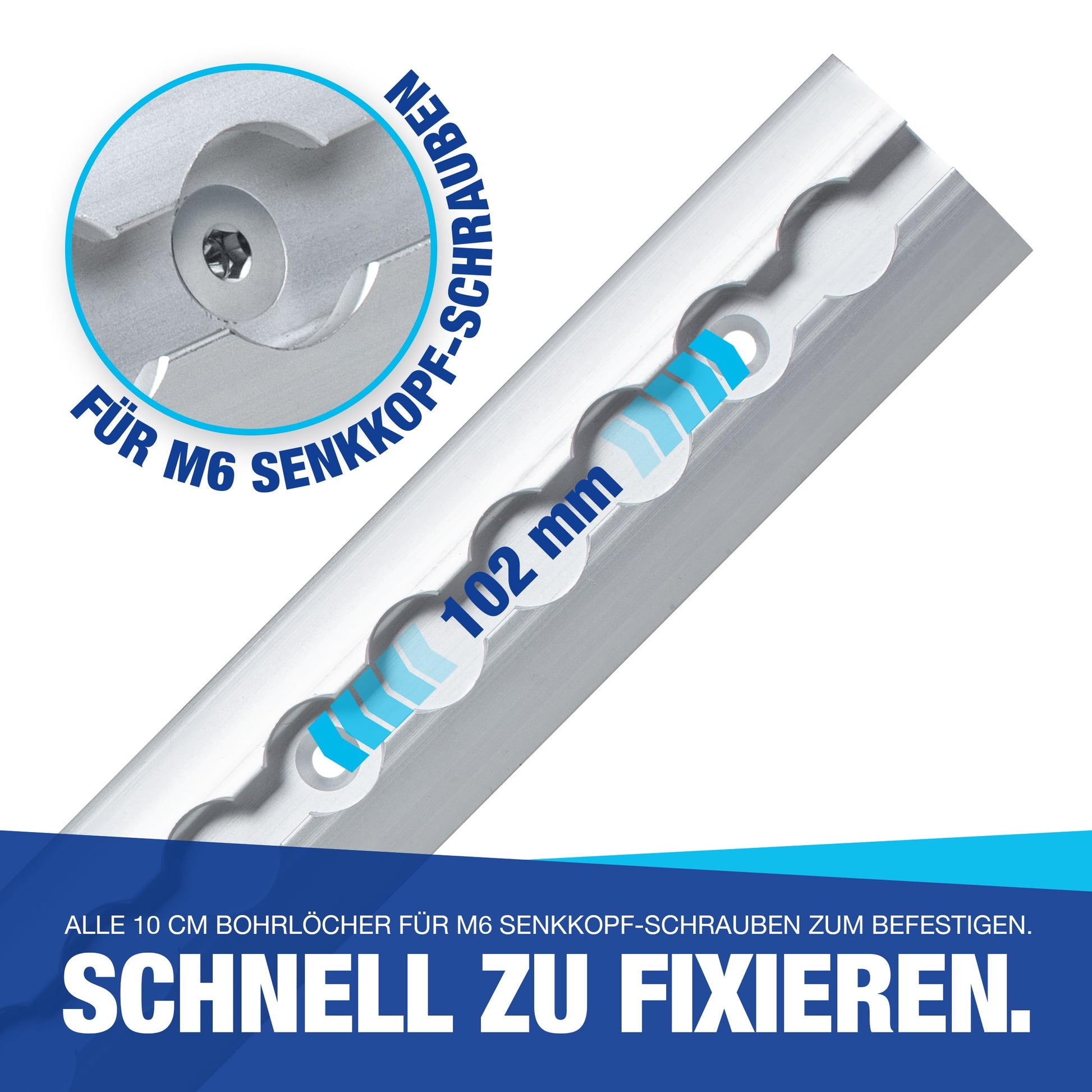 Ja, beides ist möglich. Die Schienen sind montagefertig mit Bohrungen für M6-Senkkopfschrauben versehen. Zusätzlich erleichtert ein praktischer Klebekanal auf der Unterseite eine saubere und sichere Verklebung.